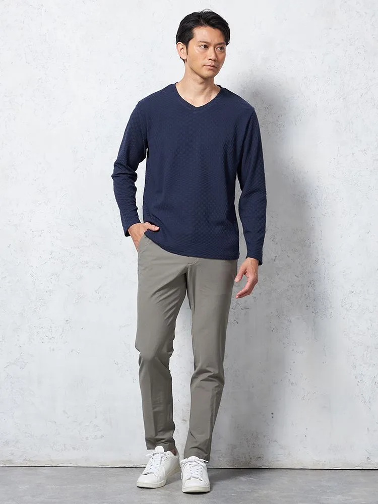 浅めのVネックは顔回りをすっきりと見せつつ上品な印象。