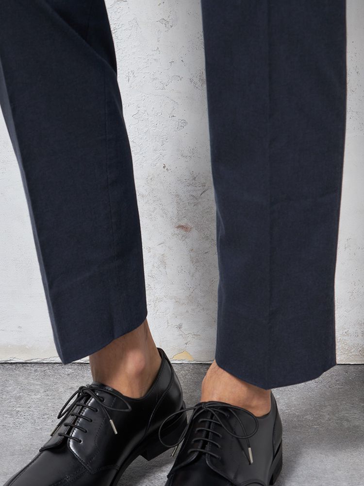 パンツの腰回りに生地の折り込みがなく、スッキリとしたシルエットを実現します。シンプルで洗練された印象を与え、すっきりとした着こなしが可能です。