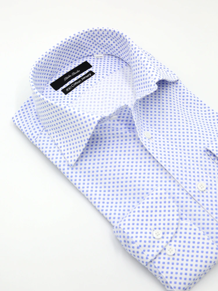 【100CottonJersey】長袖ワイシャツセミワイドプリント柄小紋ブルー綿100%リッケンバッカー通年