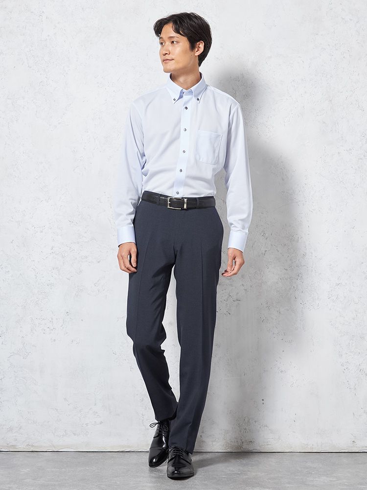 パンツの腰回りに生地の折り込みがなく、スッキリとしたシルエットを実現します。シンプルで洗練された印象を与え、すっきりとした着こなしが可能です。
