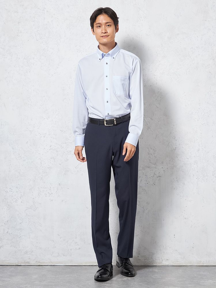 パンツの腰回りに生地の折り込みがなく、スッキリとしたシルエットを実現します。シンプルで洗練された印象を与え、すっきりとした着こなしが可能です。
