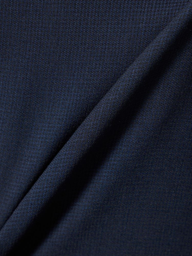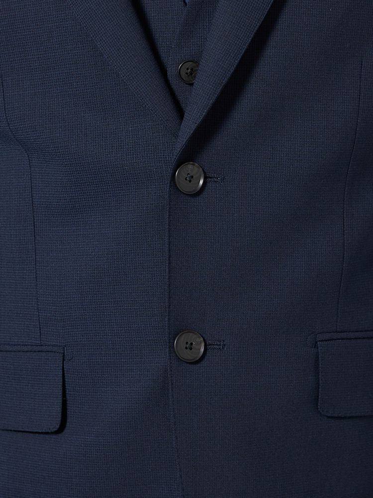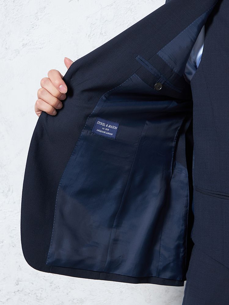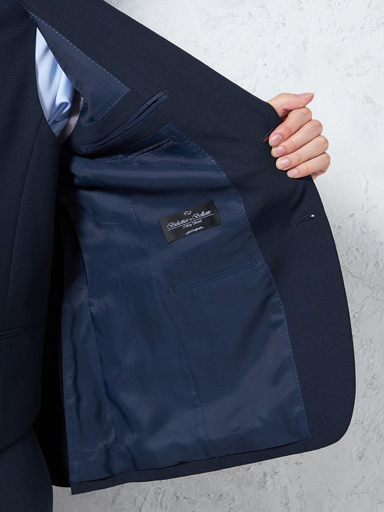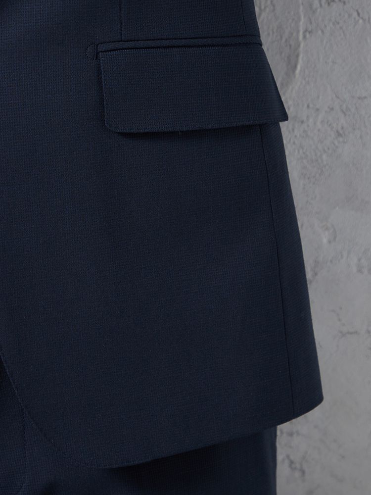 細かな千鳥柄をネービーの色味でデザインしたスーツ。