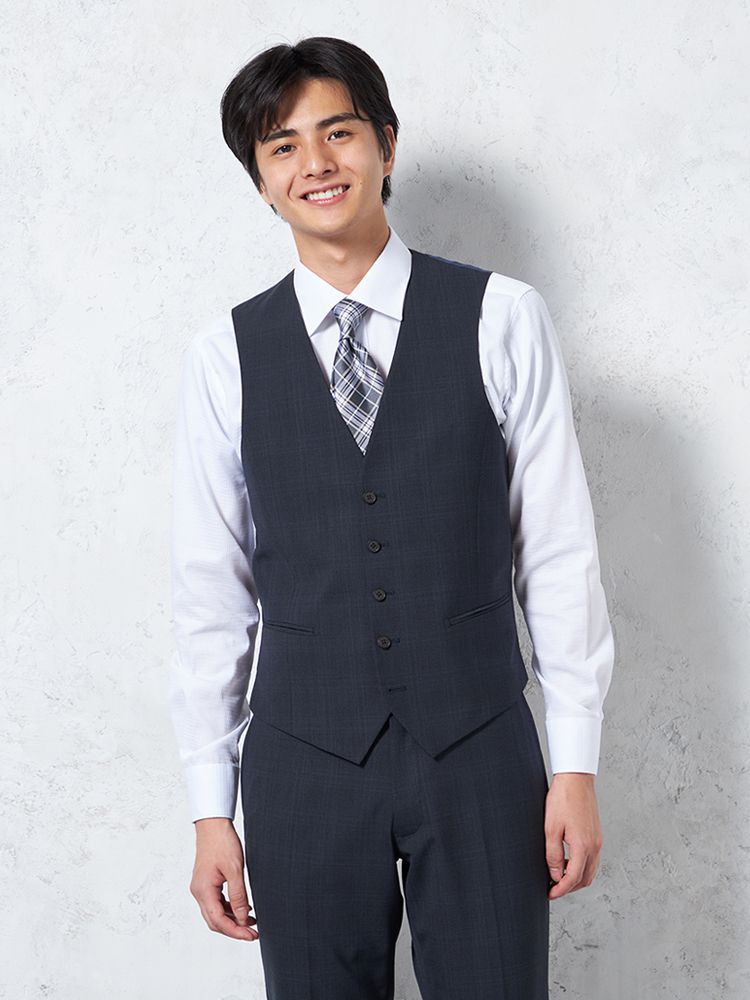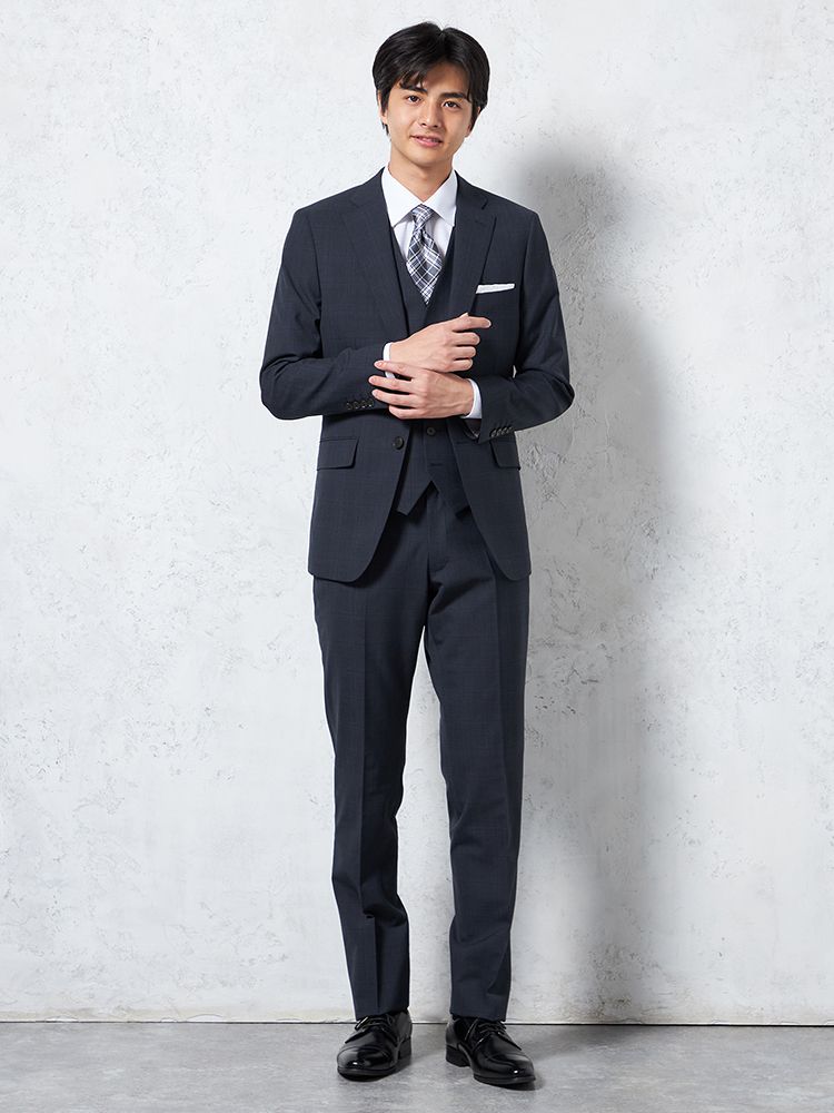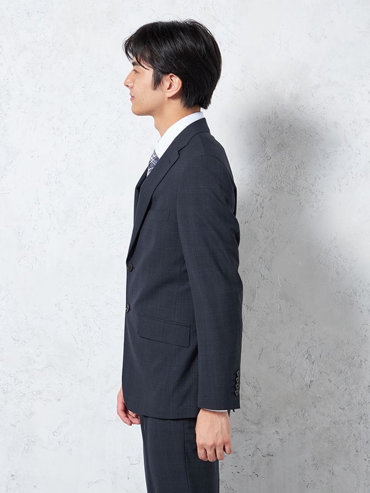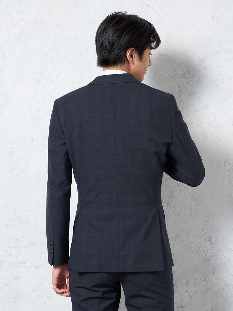 【パンツウォッシャブル】スリーピーススーツ 2つボタン 背抜き ノータック ネイビー チェック S&M BLUE LABEL