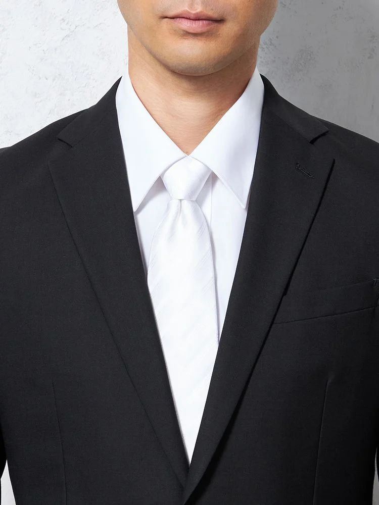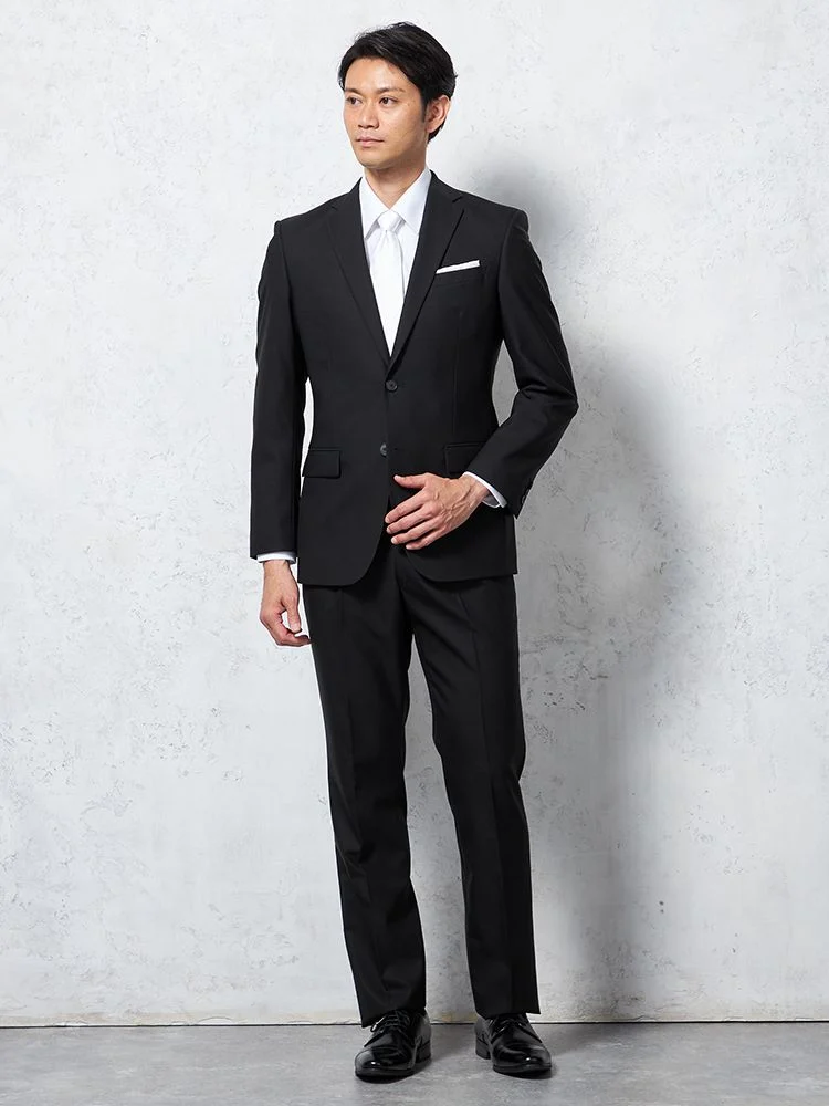 冠婚葬祭で年代問わず使えるベーシックなブラックフォーマルスーツ。