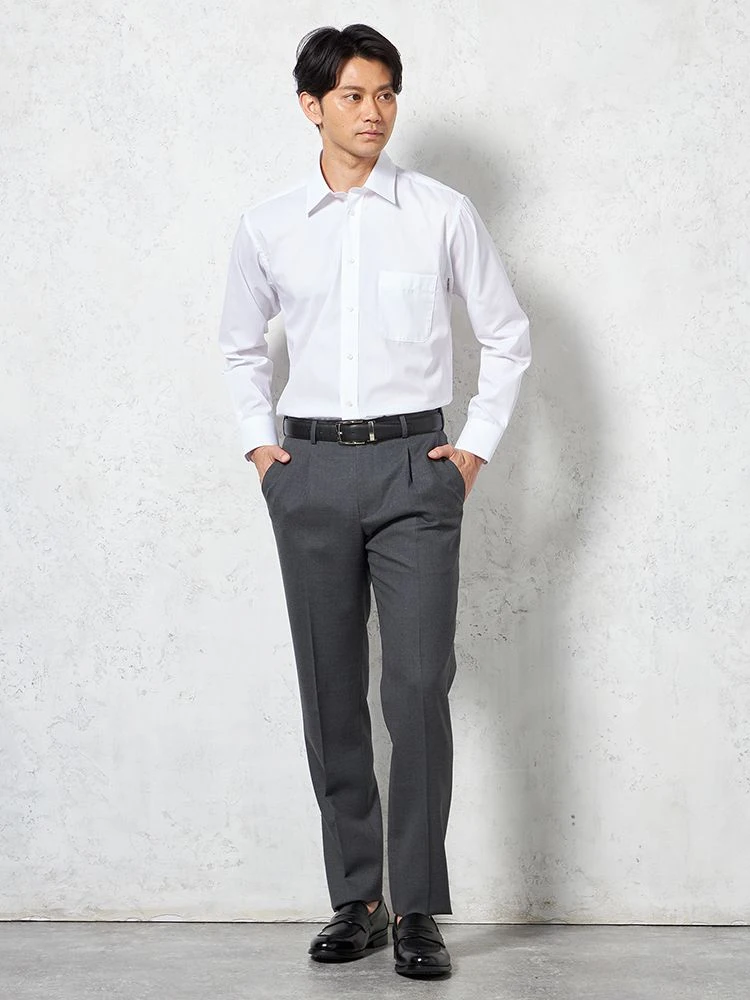 細身すぎず、太すぎない程良いシルエットで好印象を誘うスーツスタイルを演出。