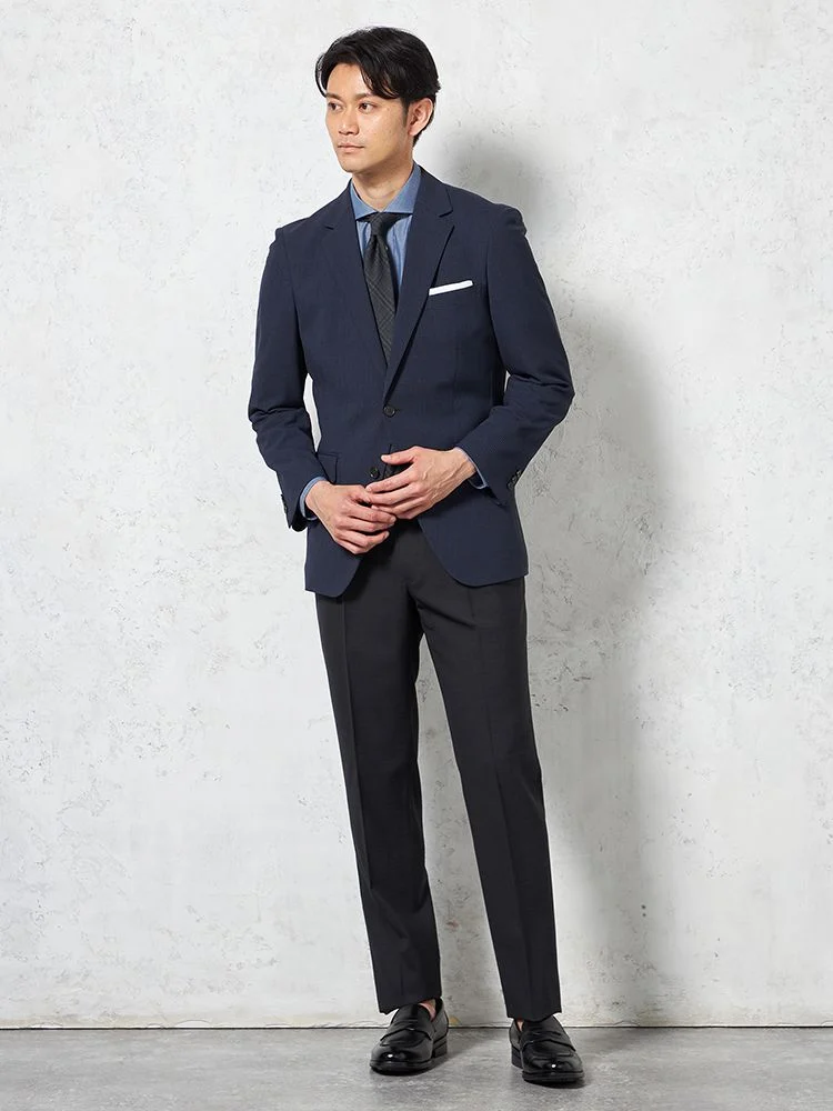 切り込みが1本のセンターベントデザインです。細身でスッキリとしたシルエットが特徴で、快適な着心地を提供します