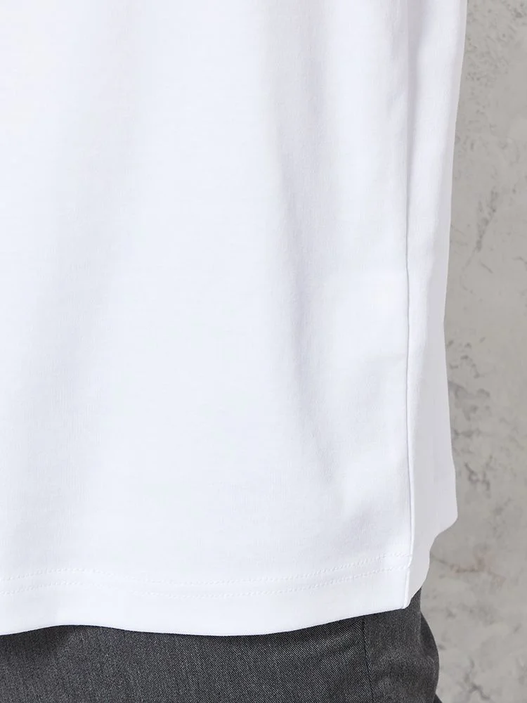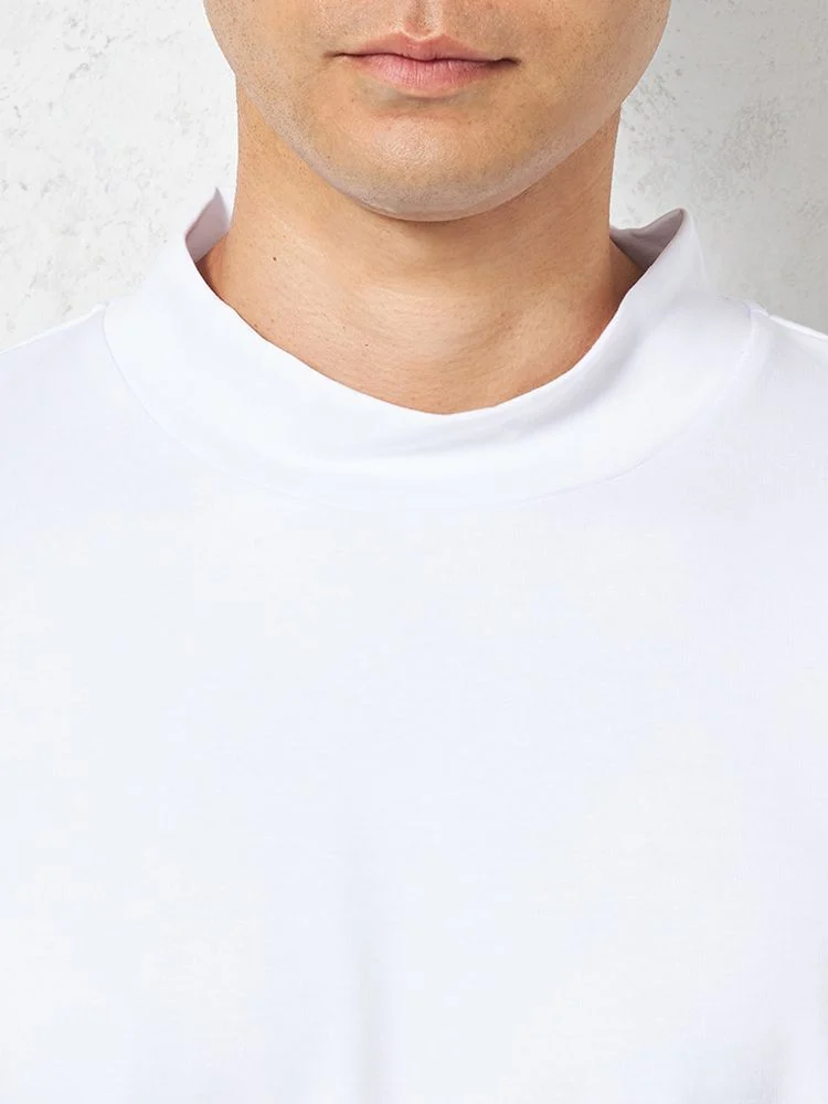 シルクのような美しい光沢や風合いを生むシルケット加工を施したモックネックTシャツ。