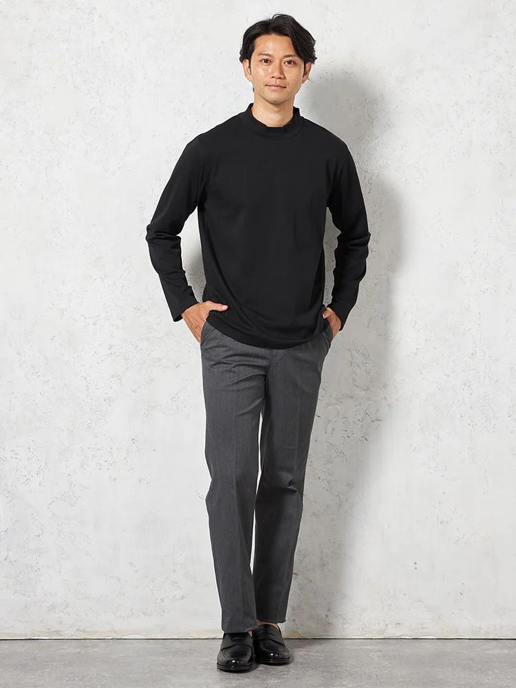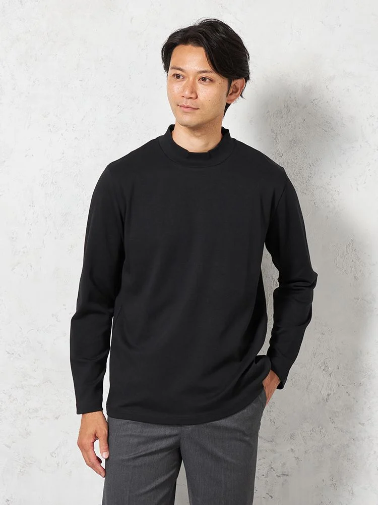 綿100パーセントのスムース生地できれい感があり、後ろ襟に高さを出したモックネックで、ジャケットコーデにも映える1枚に仕上げました。