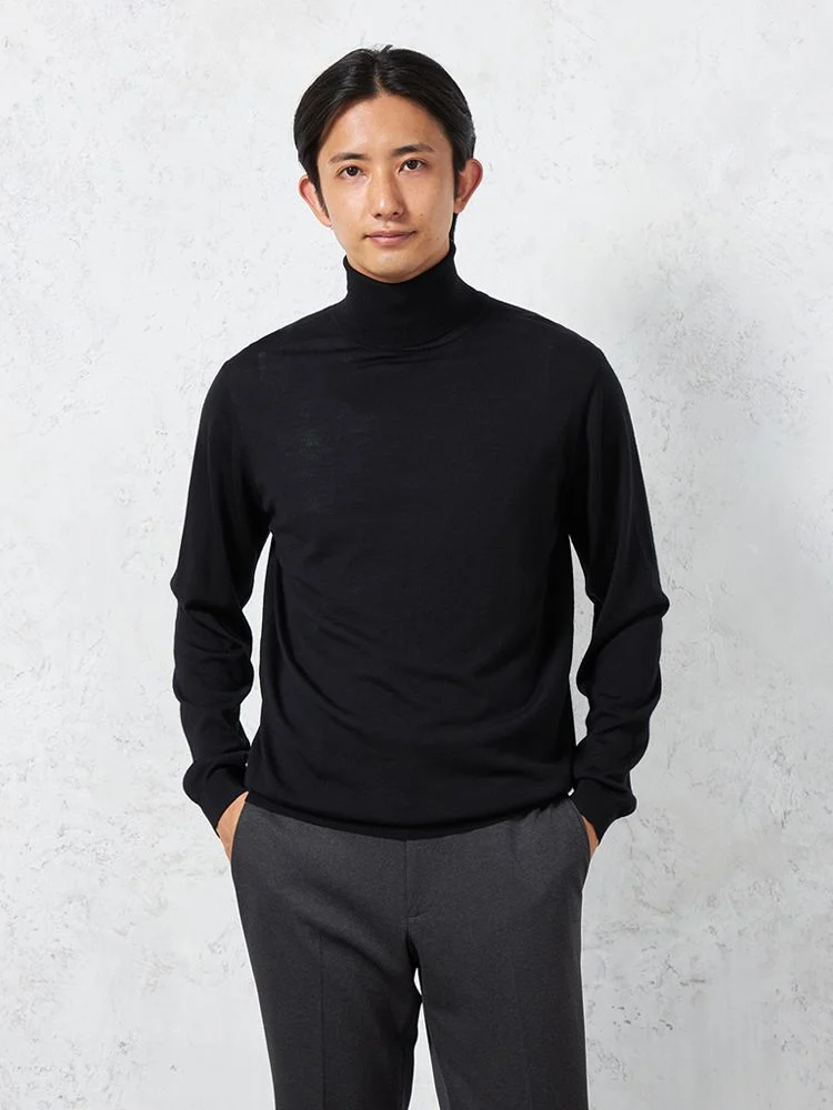 【ウール100%】梳毛 タートルネックセーター カジュアルインナー 無地 リッケンバッカーブラック 秋冬
