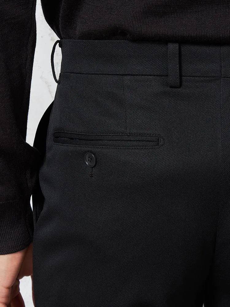 ビジネスからフォーマルまで、着用シーンを選ばないシンプルなブラック×無地のスラックス。