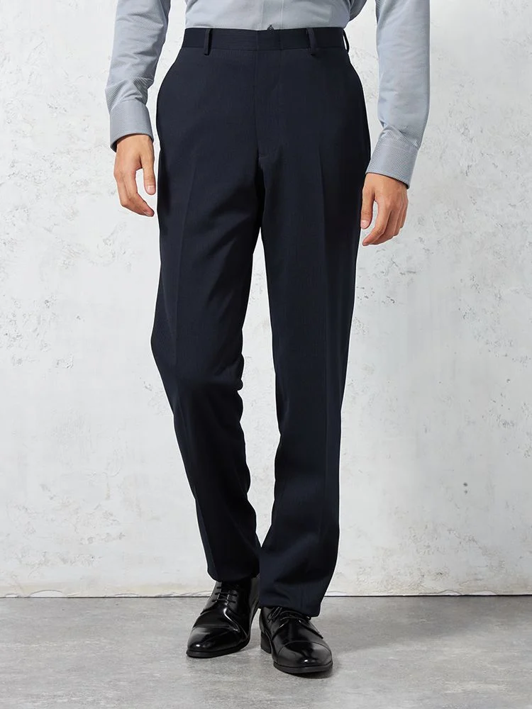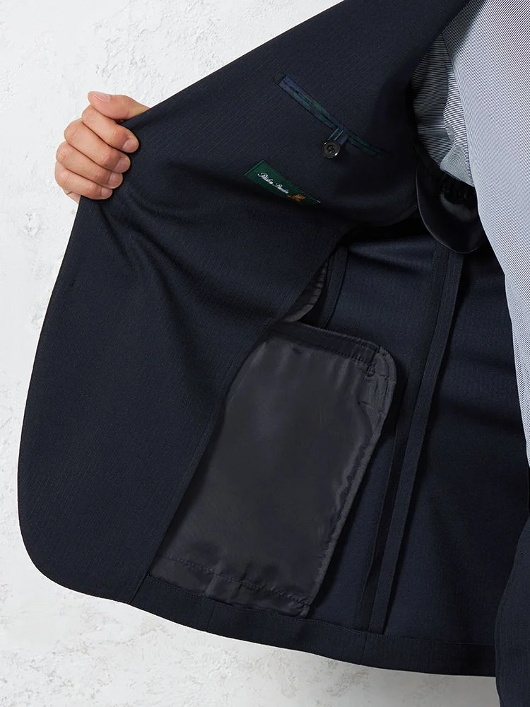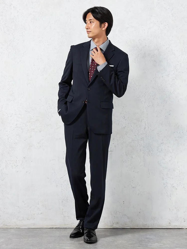 毎日のビジネススタイルにはもちろん、パーティーなどのオケージョンシーンにも映える、深みのあるネイビーカラーの2つボタンスーツ。