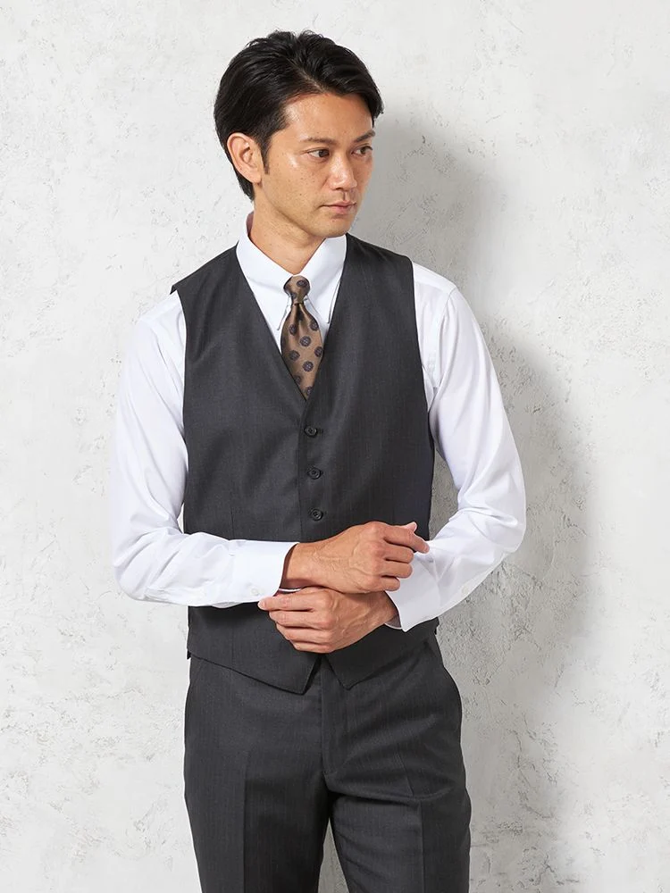 ジャケット、パンツ、ベストの3点セットで、スーツ全体を簡単にコーディネートできます。ビジネスやフォーマルな場面に最適です。