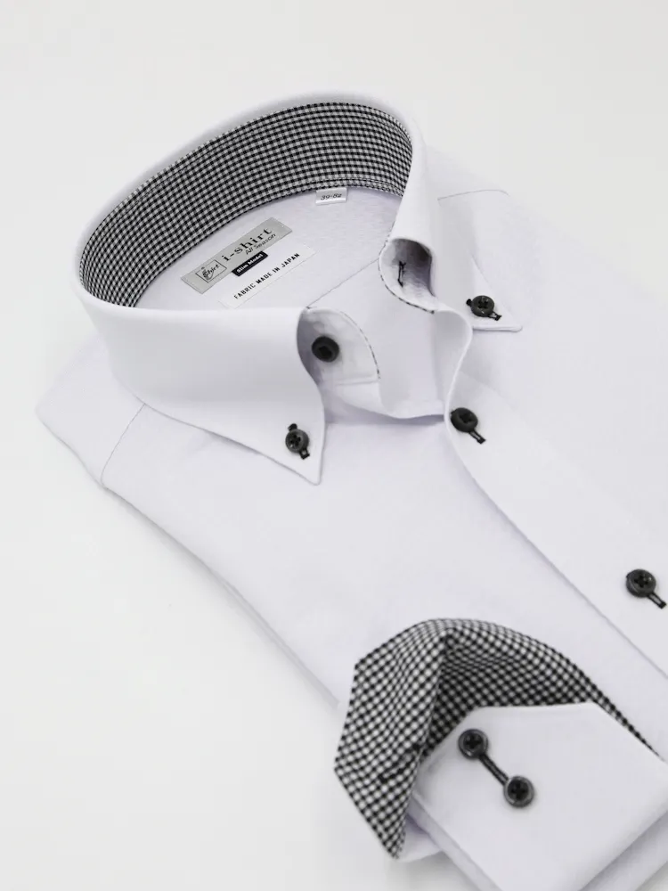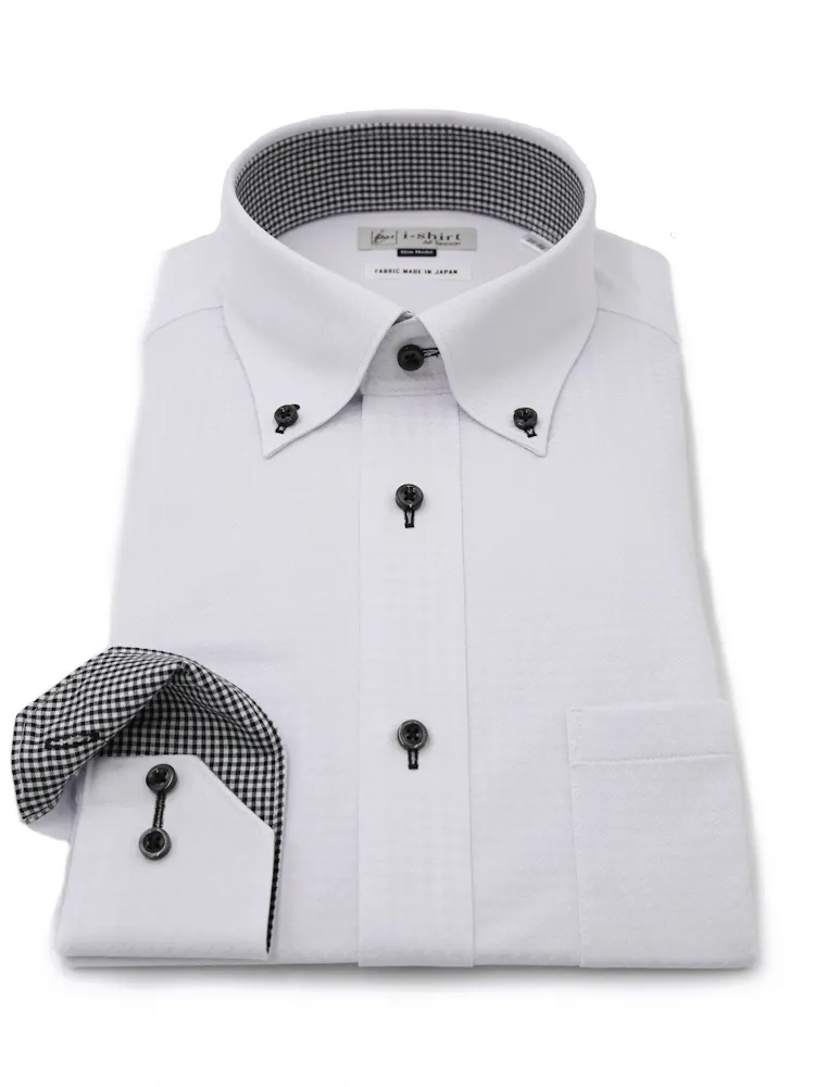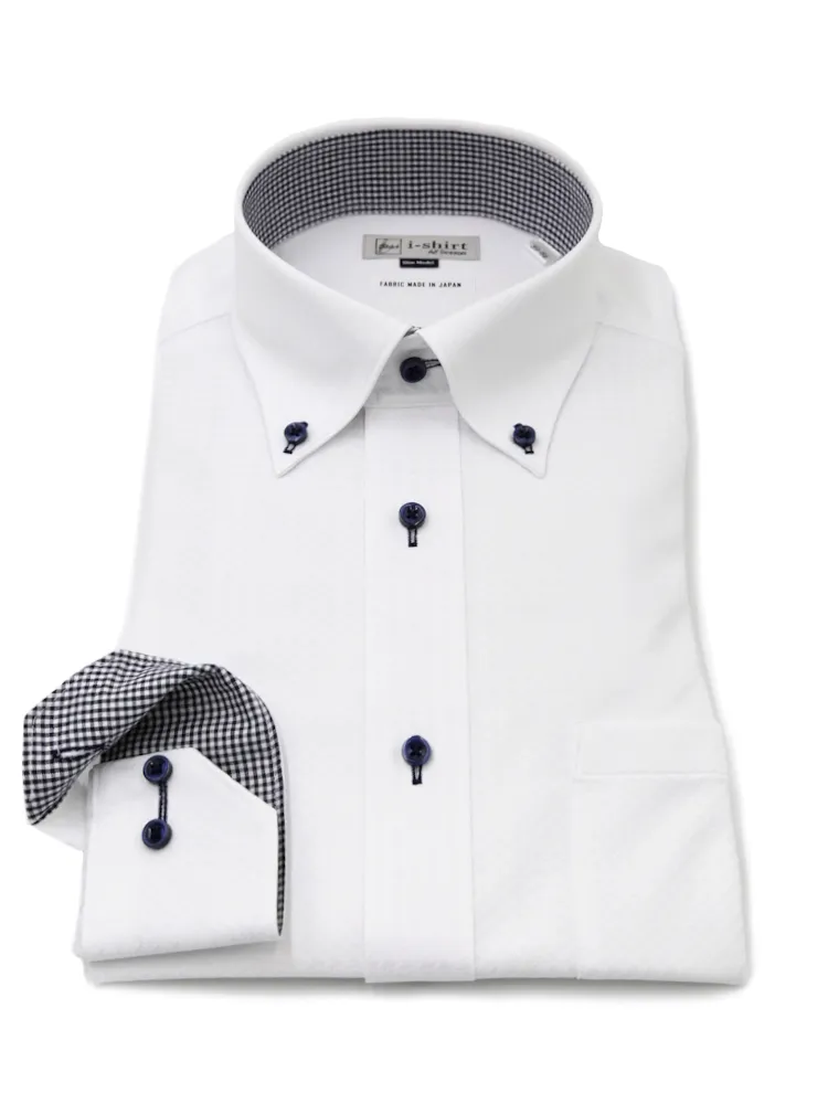 【完全ノーアイロン】長袖 アイシャツ ボタンダウン 千鳥格子 ストレッチ 吸汗速乾 ワイシャツ i-shirt 通年(ホワイト)
