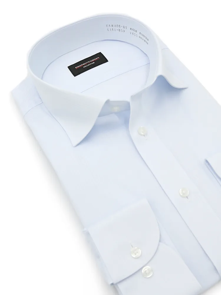 ビジネスシーンに重宝するシンプルデザインとスタンダードな襟型のセミワイドカラ―シャツ。