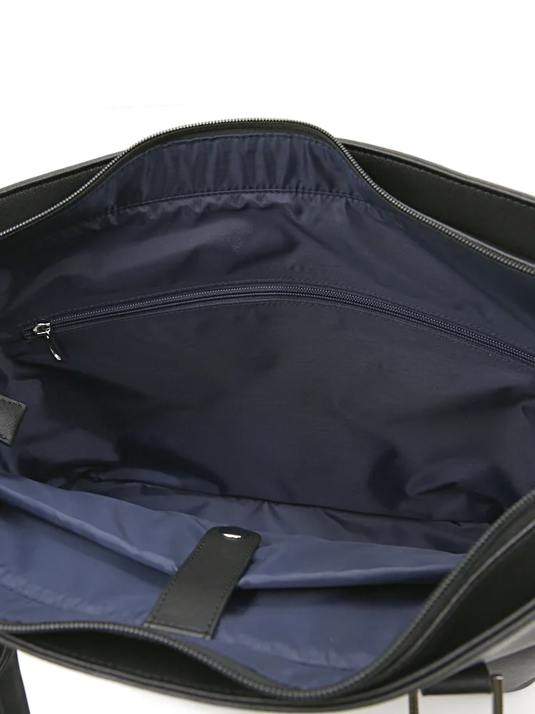 サフィアーノ調の型押し合成皮革に、前面のメタルファスナーポケットがアクセントになり、シャープでスマートな印象です。
