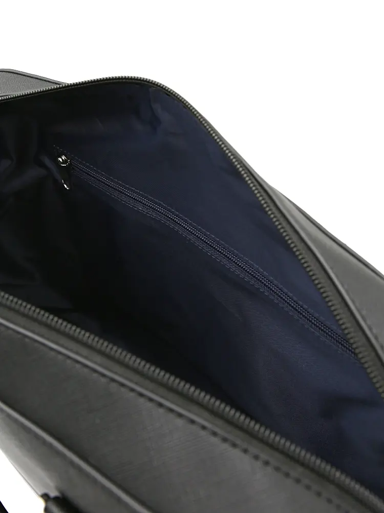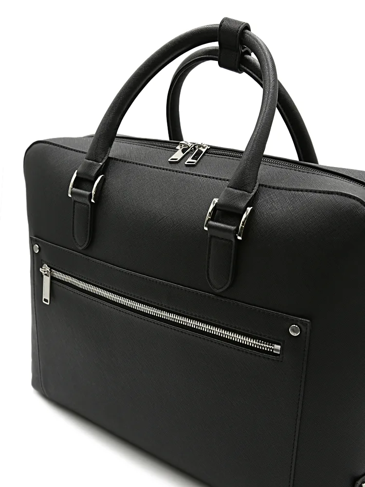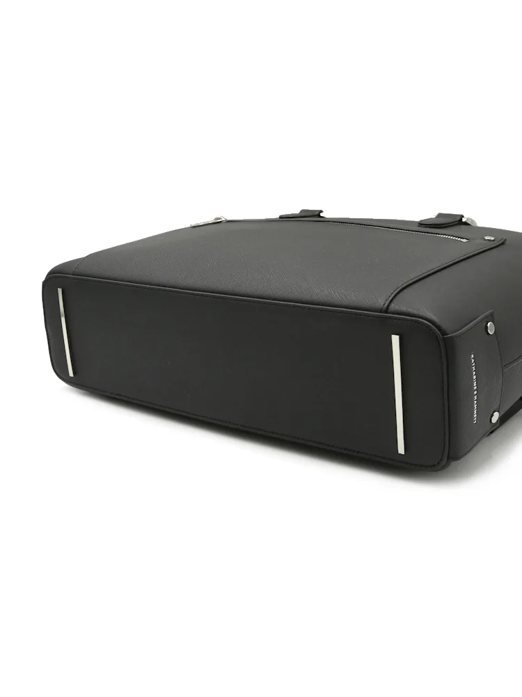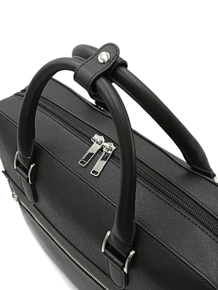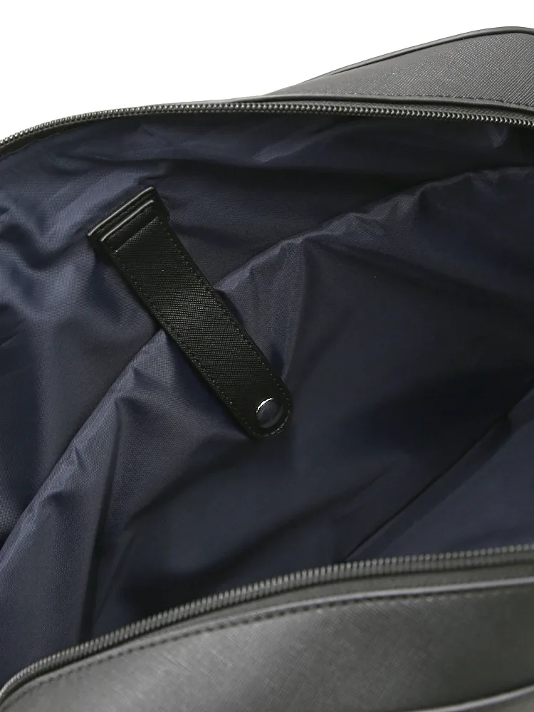 サフィアーノ調型押しの合成皮革に、前面のメタルファスナーポケットがアクセントになりシャープでスマートな印象。