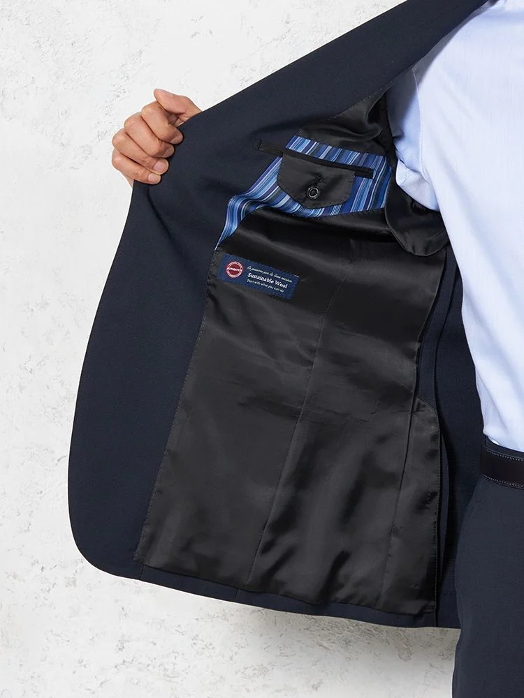 サスティナブルウール素材を使用し、環境にも配慮したツーピーススーツ。