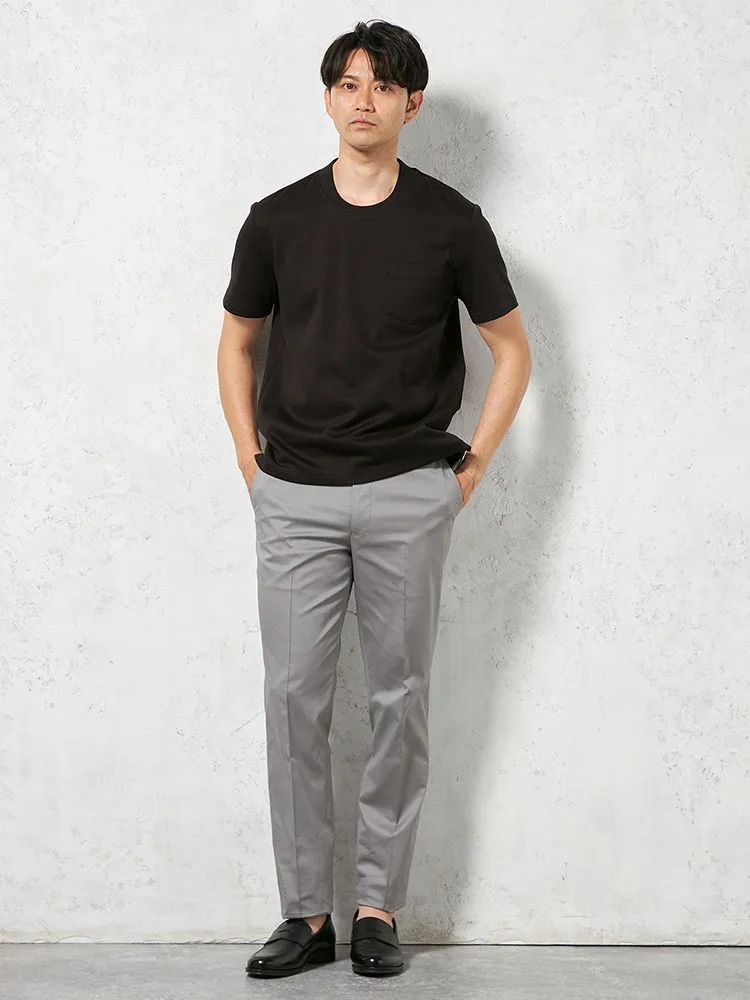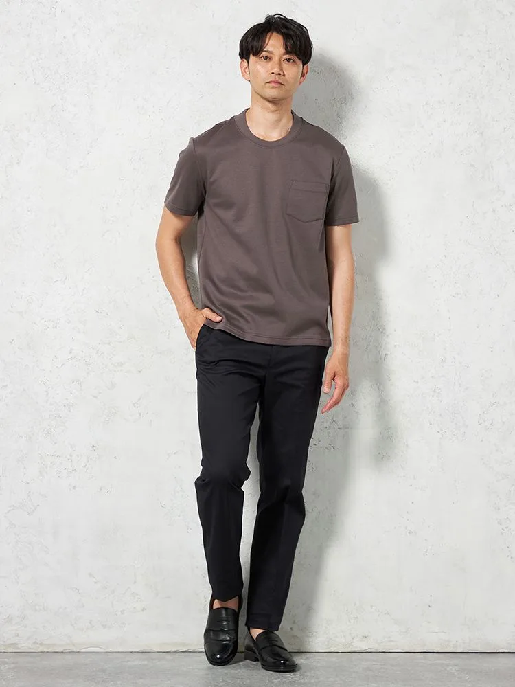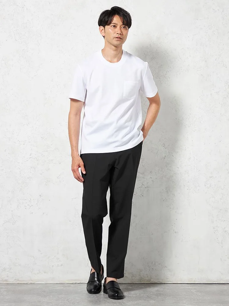 スロープネックとシンプルな無地デザインでビジネスカジュアルはもちろん、幅広いシーンで着用いただけます。