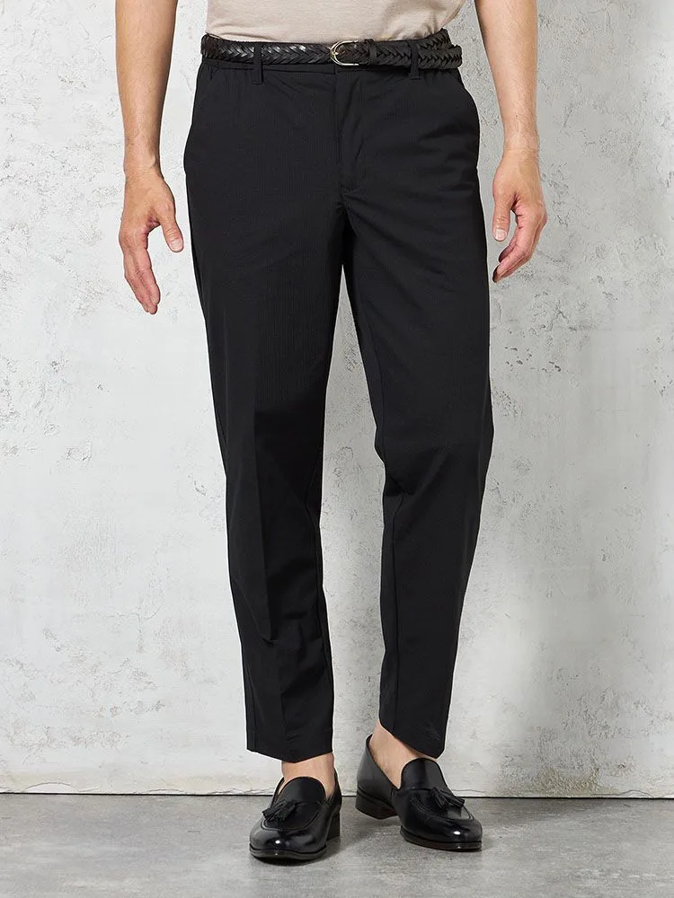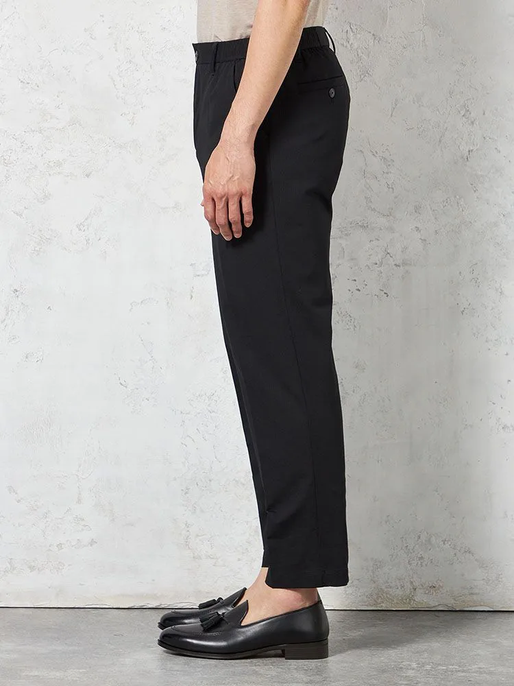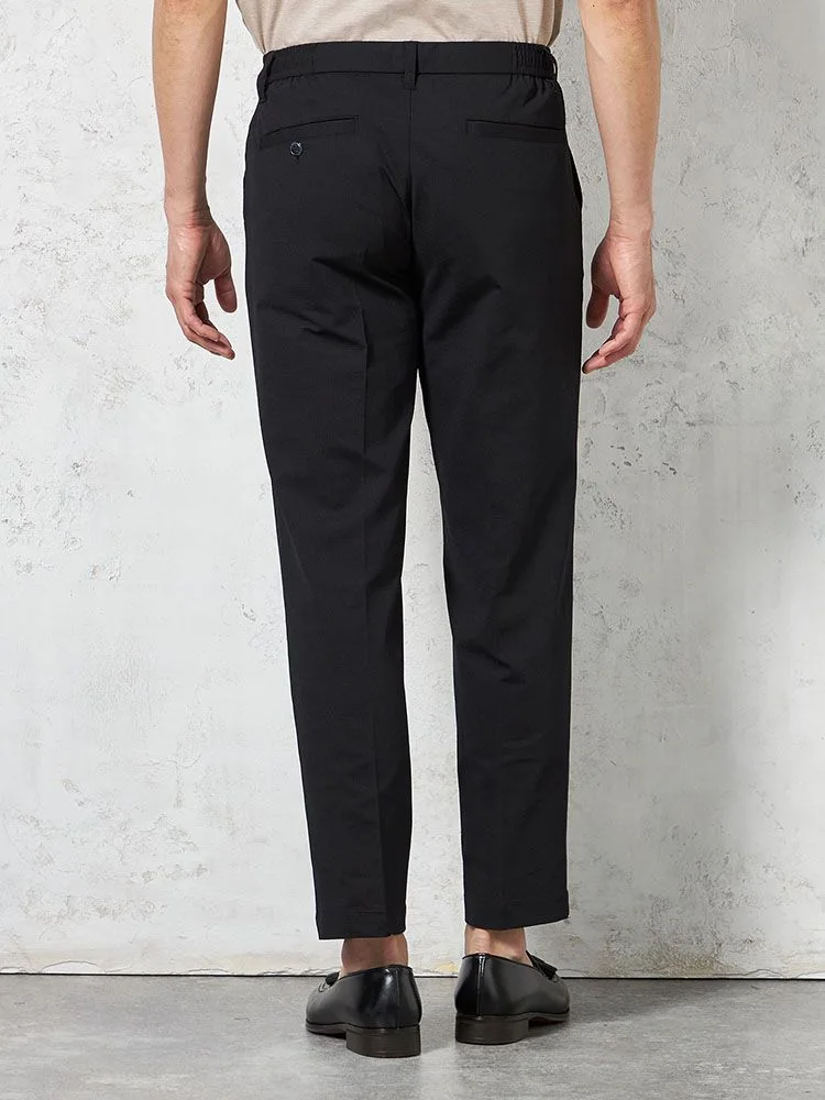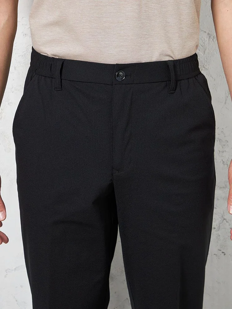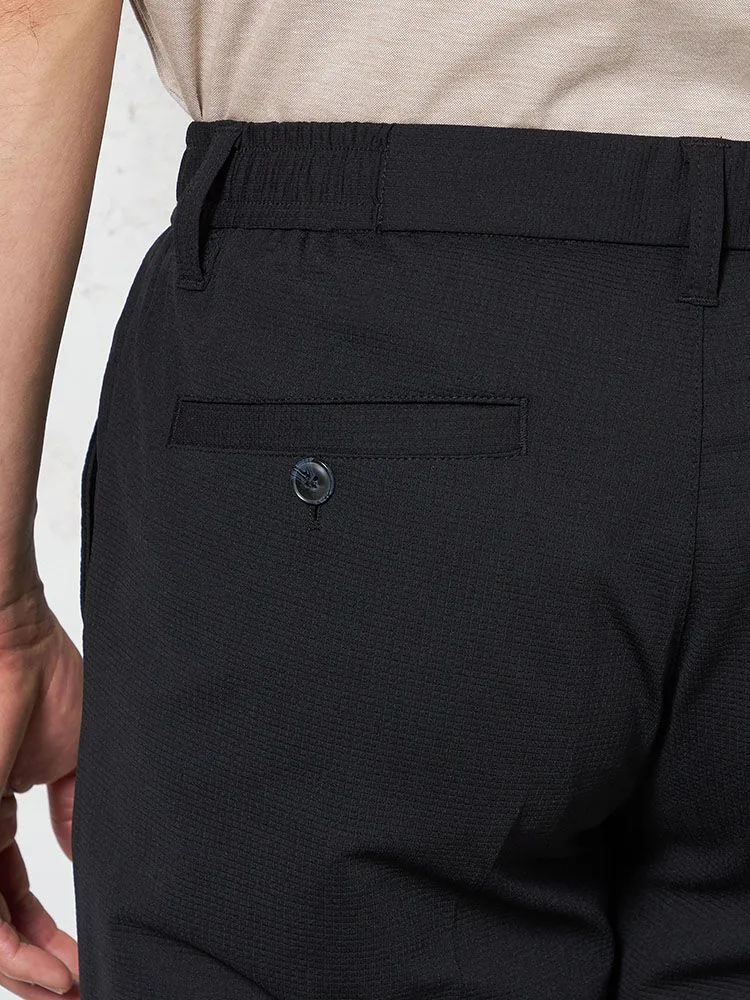 パンツの腰回りに生地の折り込みがなく、スッキリとしたシルエットを実現します。シンプルで洗練された印象を与え、すっきりとした着こなしが可能です。