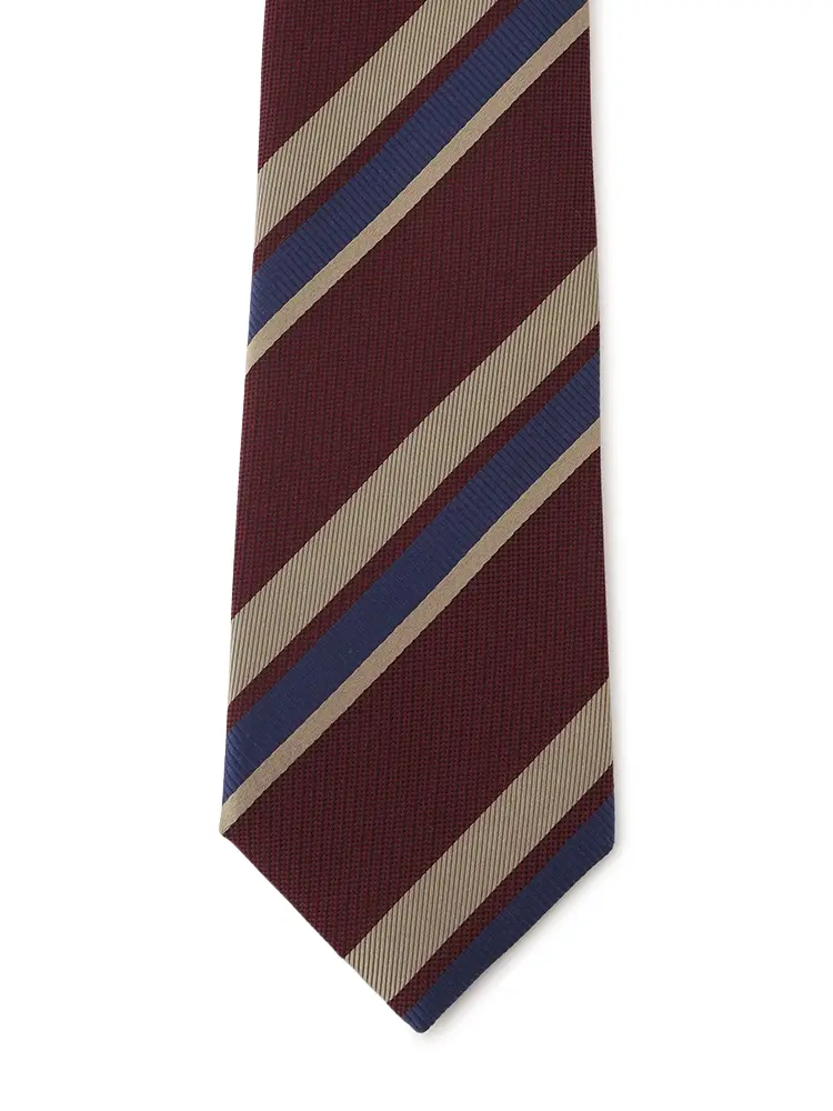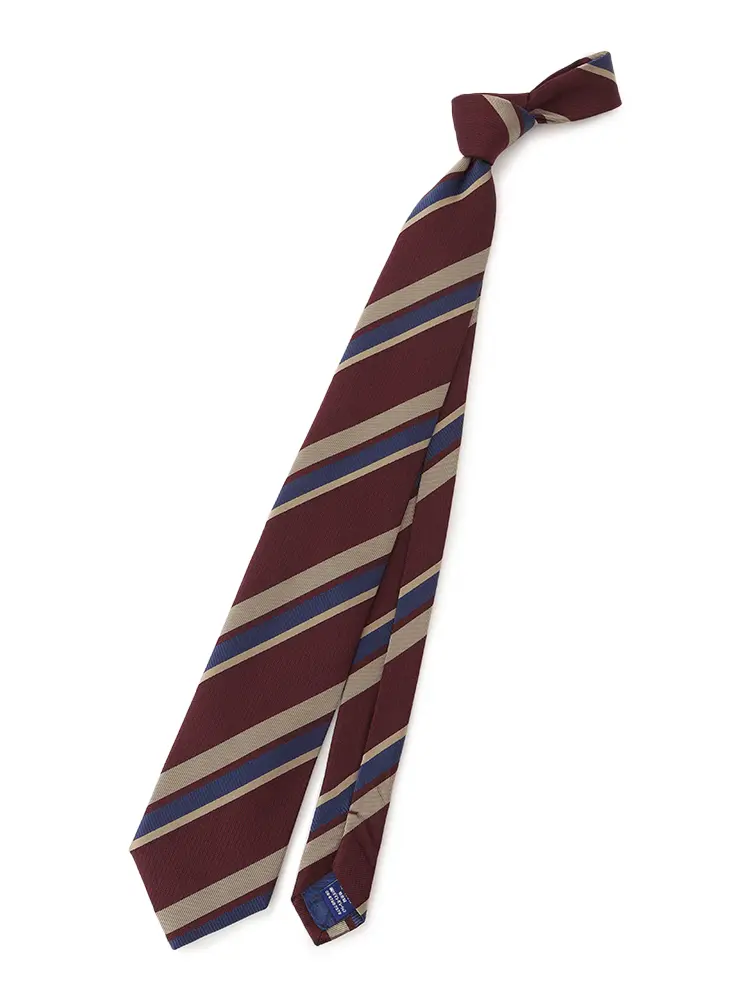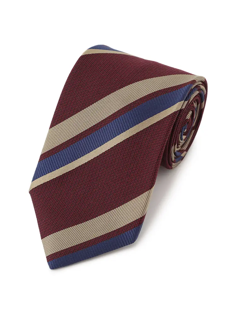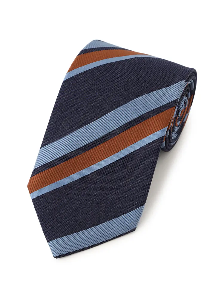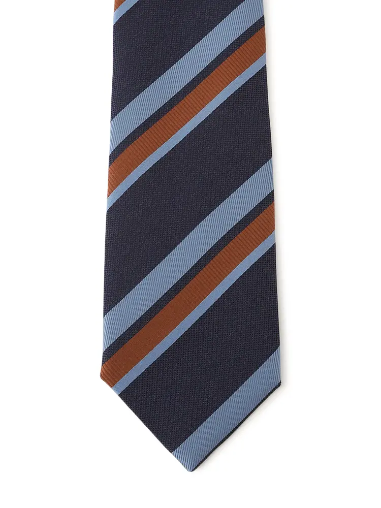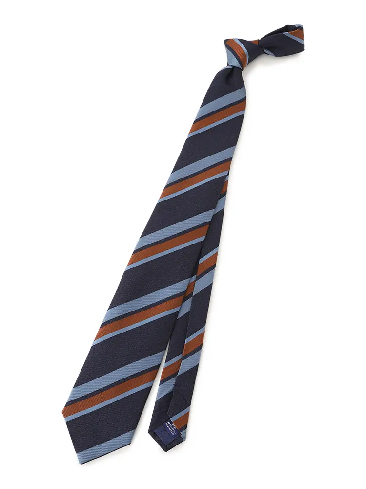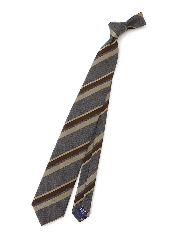 さまざまな織柄と色を交えた、コントラストが際立つレジメンタルストライプタイです。