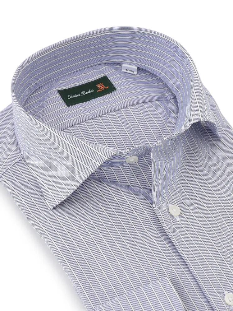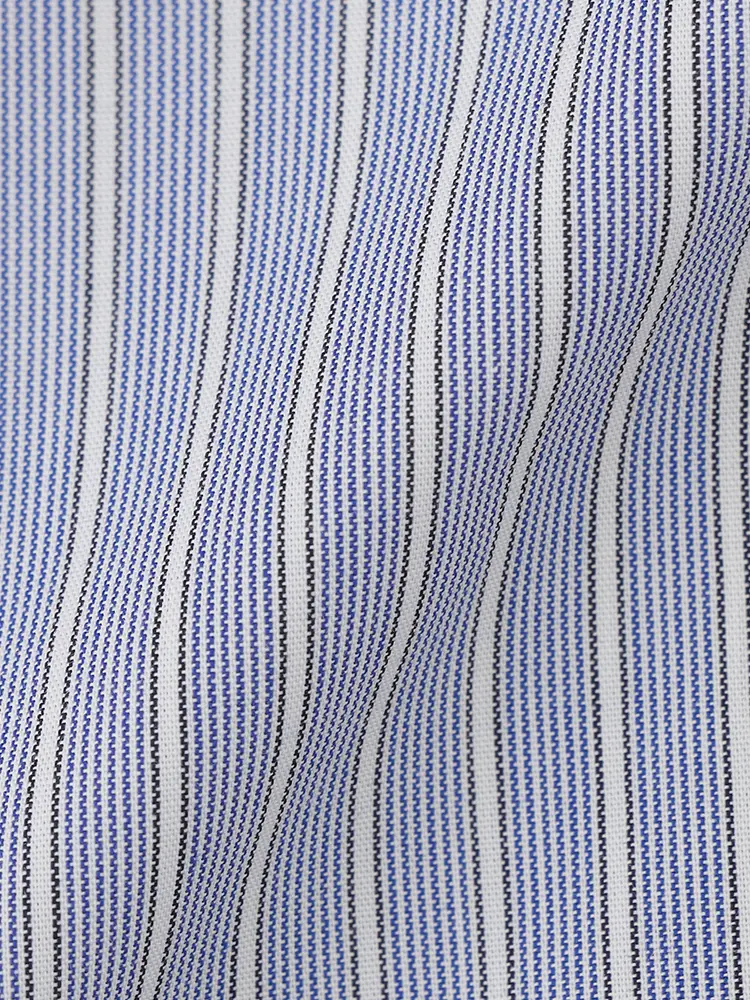 ネイビーカラーの繊細なストライプパターンが知的で落ち着いた印象を与えるワイシャツです。