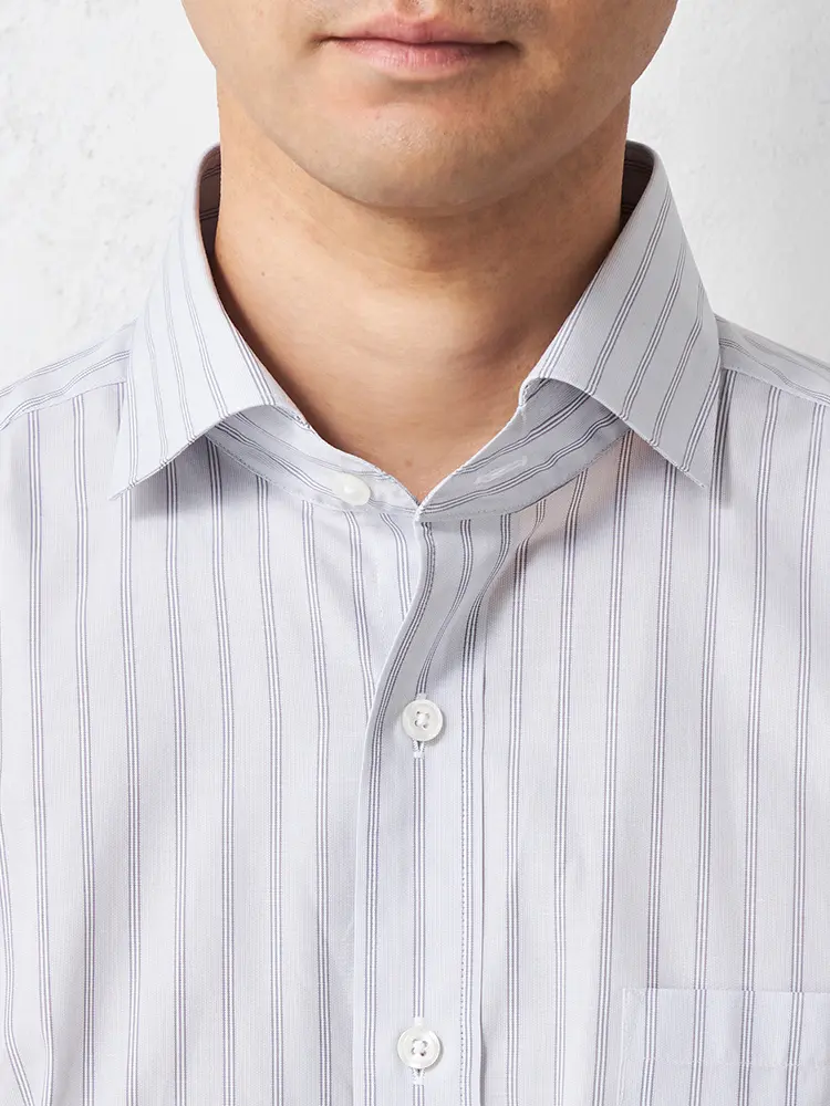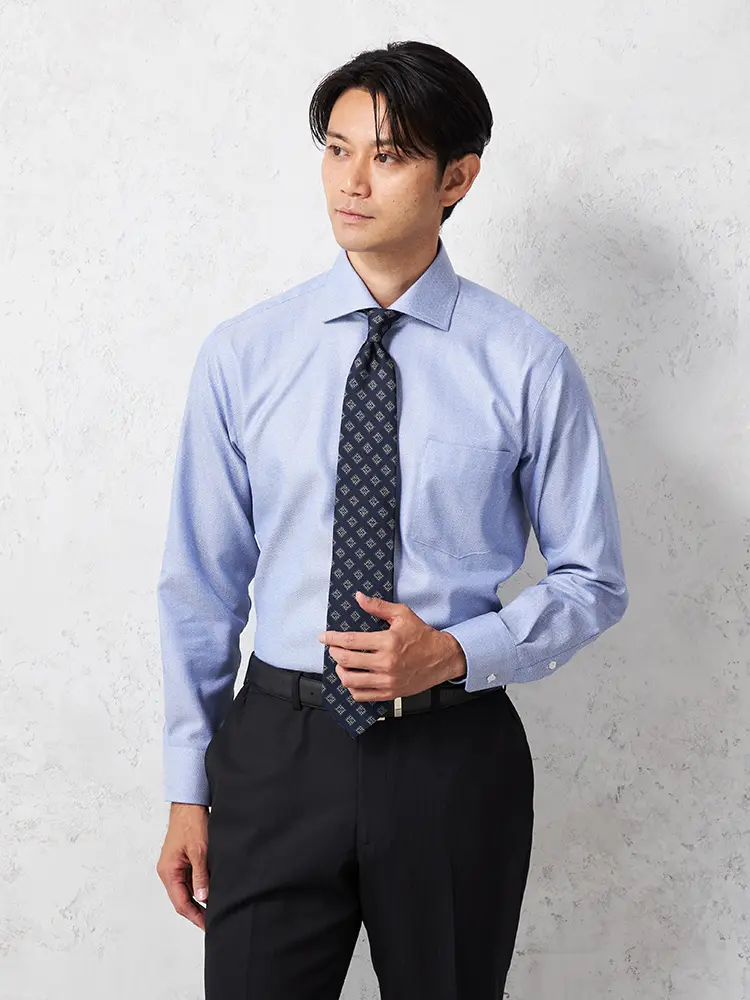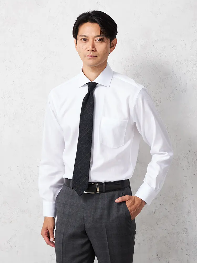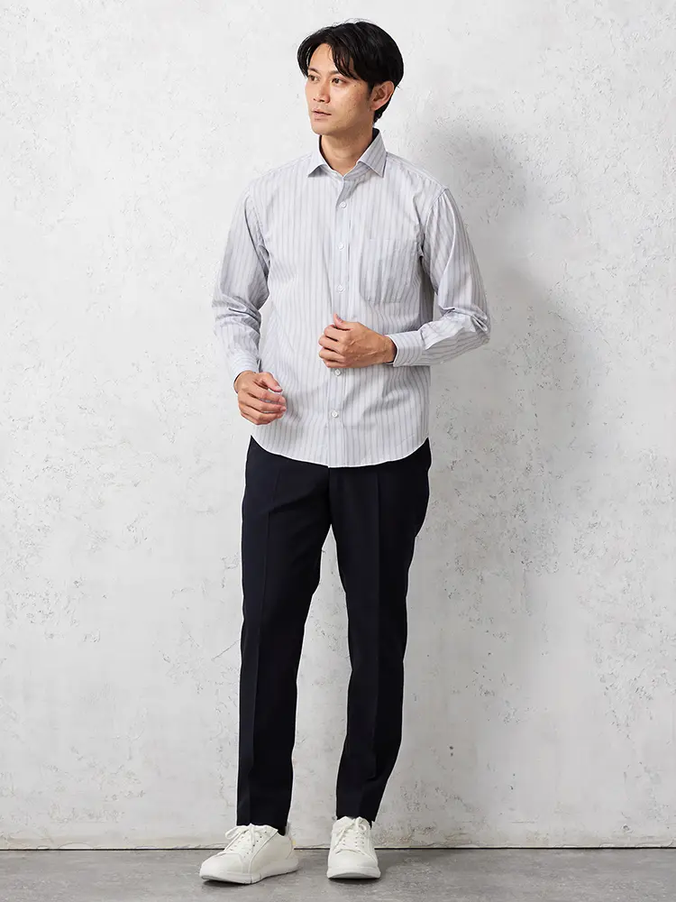 毎日のビジネススタイルにぴったりな、ノーネクタイでも着られる長袖シャツです。