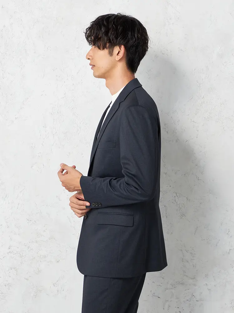 ノッチドラペル、センターベント、背抜き仕様のシンプルでクラシカルなデザインのシングルジャケット。