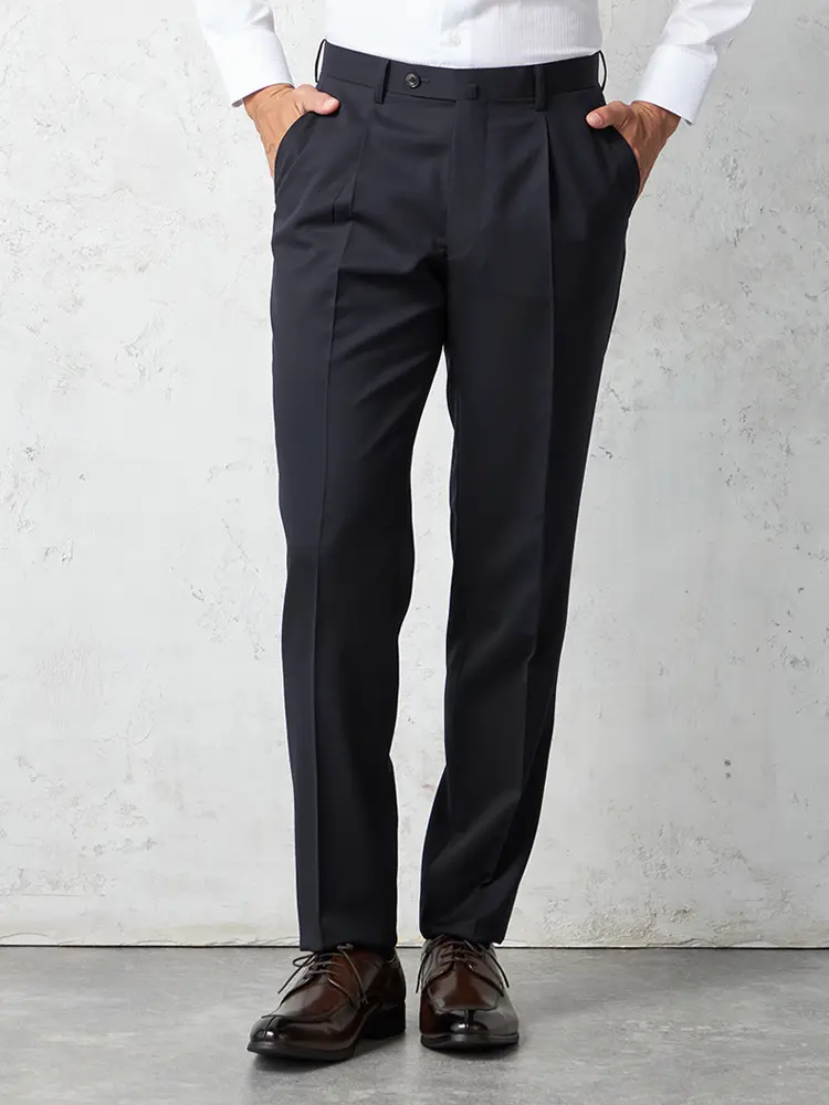 パンツはクラシカルで落ち着いた印象を与えるワンタック仕様。