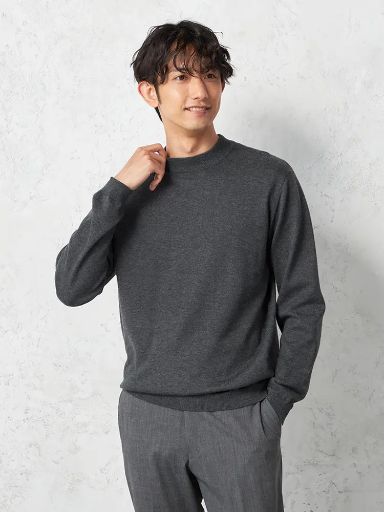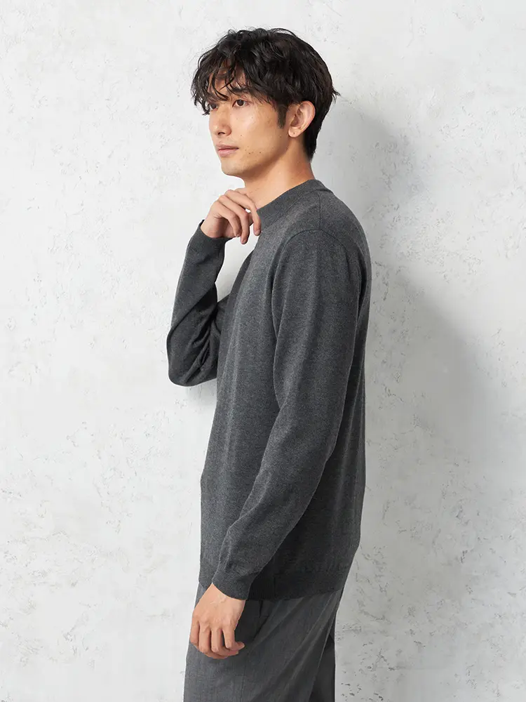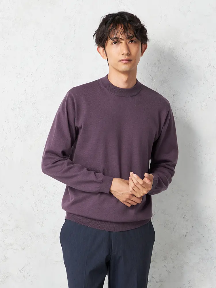 寒い季節にも快適に過ごすため、吸湿発熱素材を使用したモックネックロングスリーブニット。