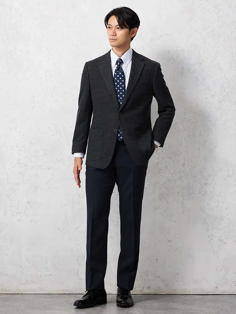 あわせるシャツやネクタイを選ばない、同素材のジャケットとのセットアップがおすすめです。