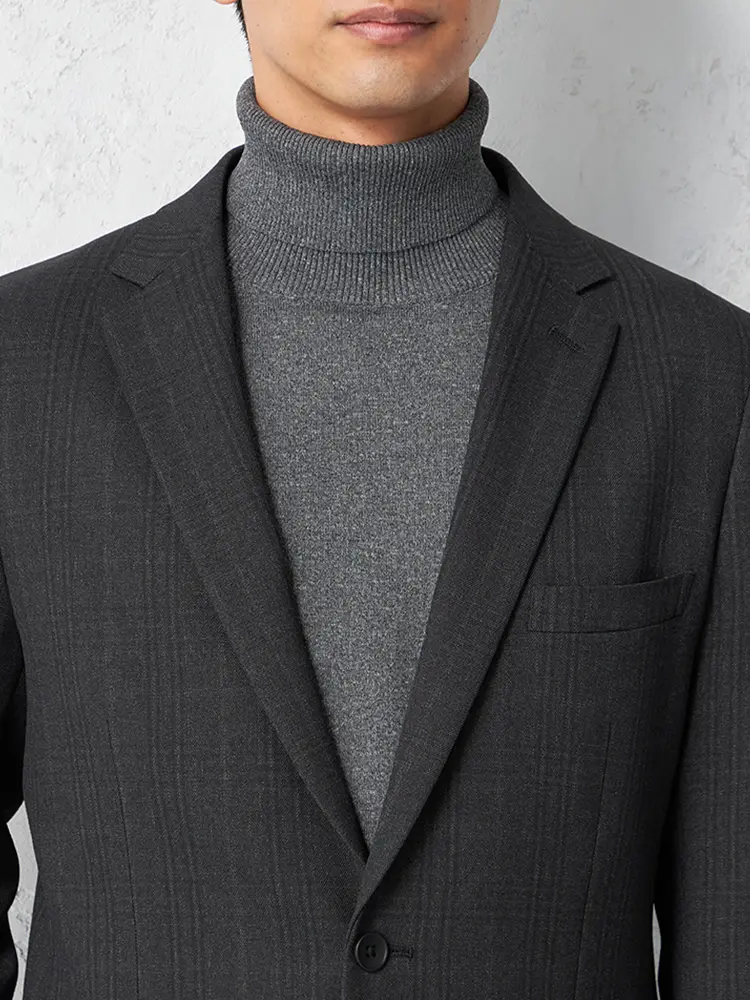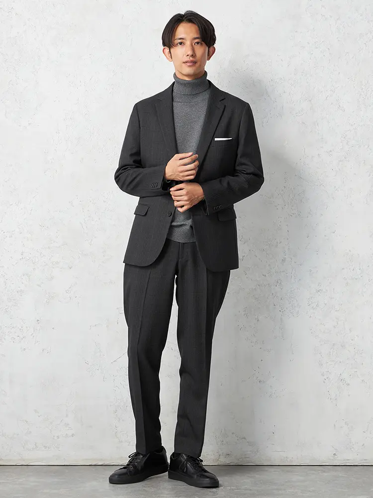 落ち着いたトラディショナルなチェック柄のバランスが良いセンターベントのスーツ。