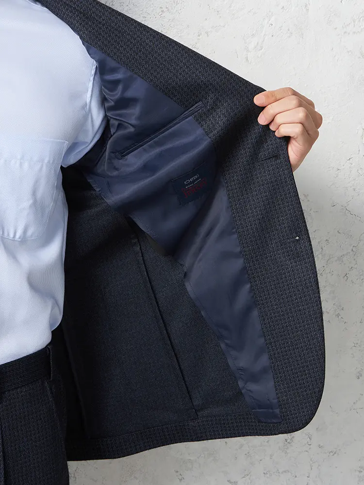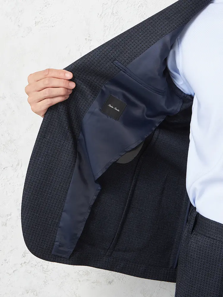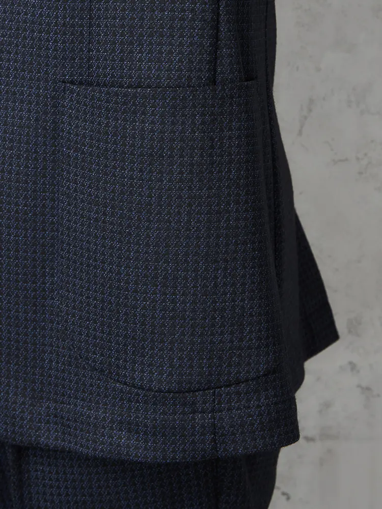 ネイビーが基調のハウンドトゥースチェックが新鮮なセットアップジャケットです。