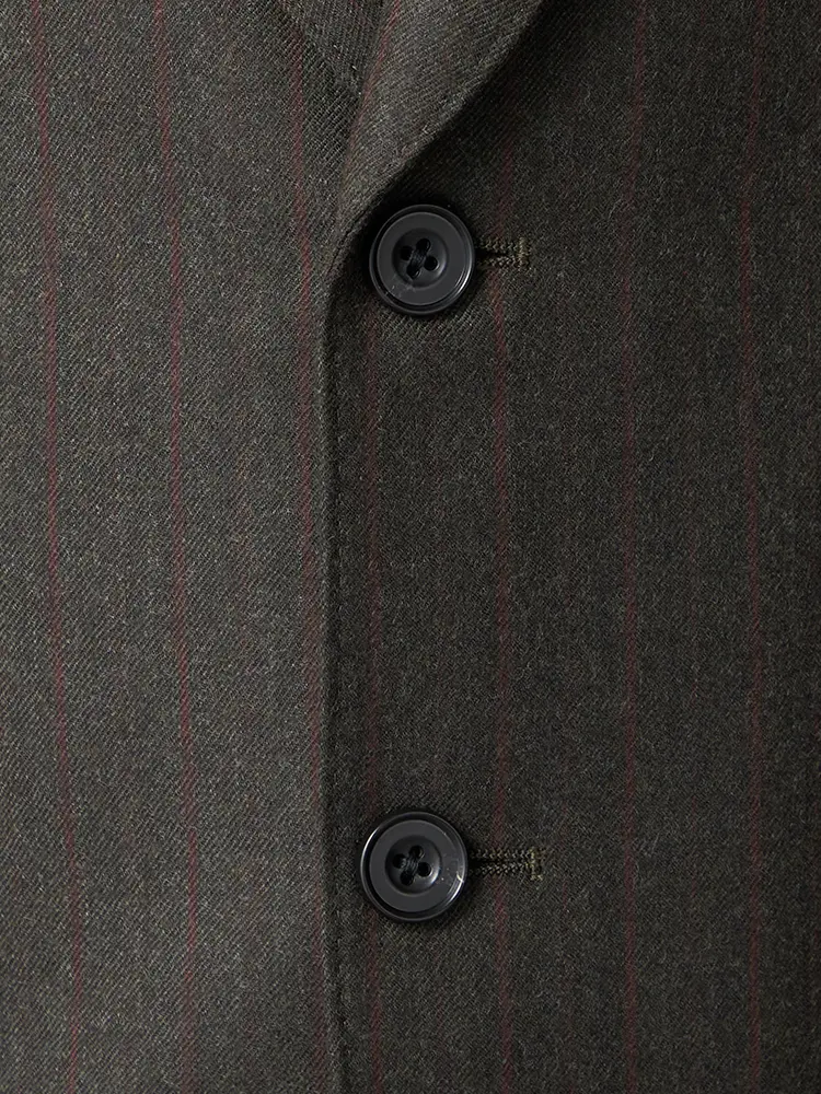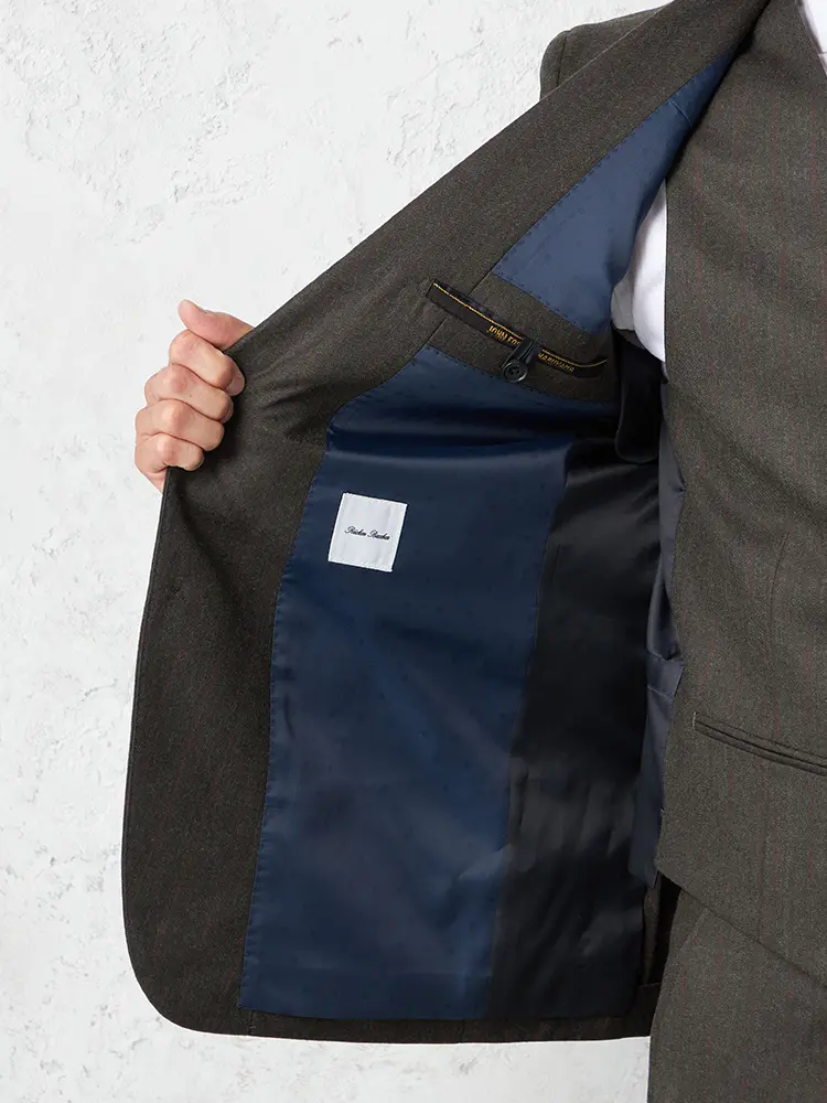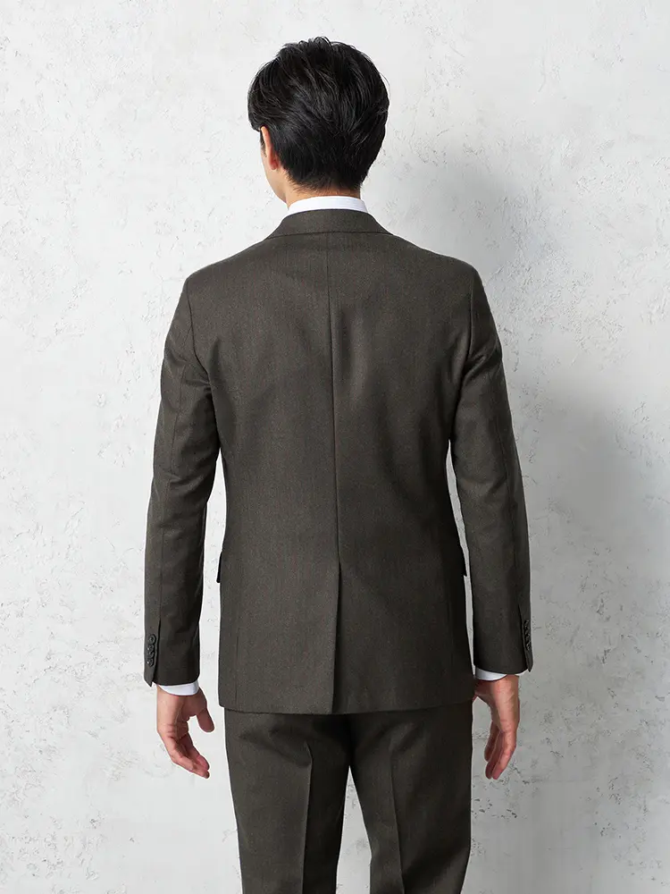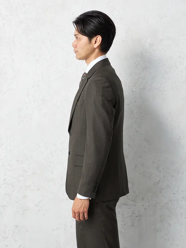 ジャケットはノッチドラペル×2つボタン、裏地は背抜き仕様のすっきりとした印象。