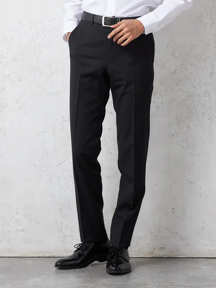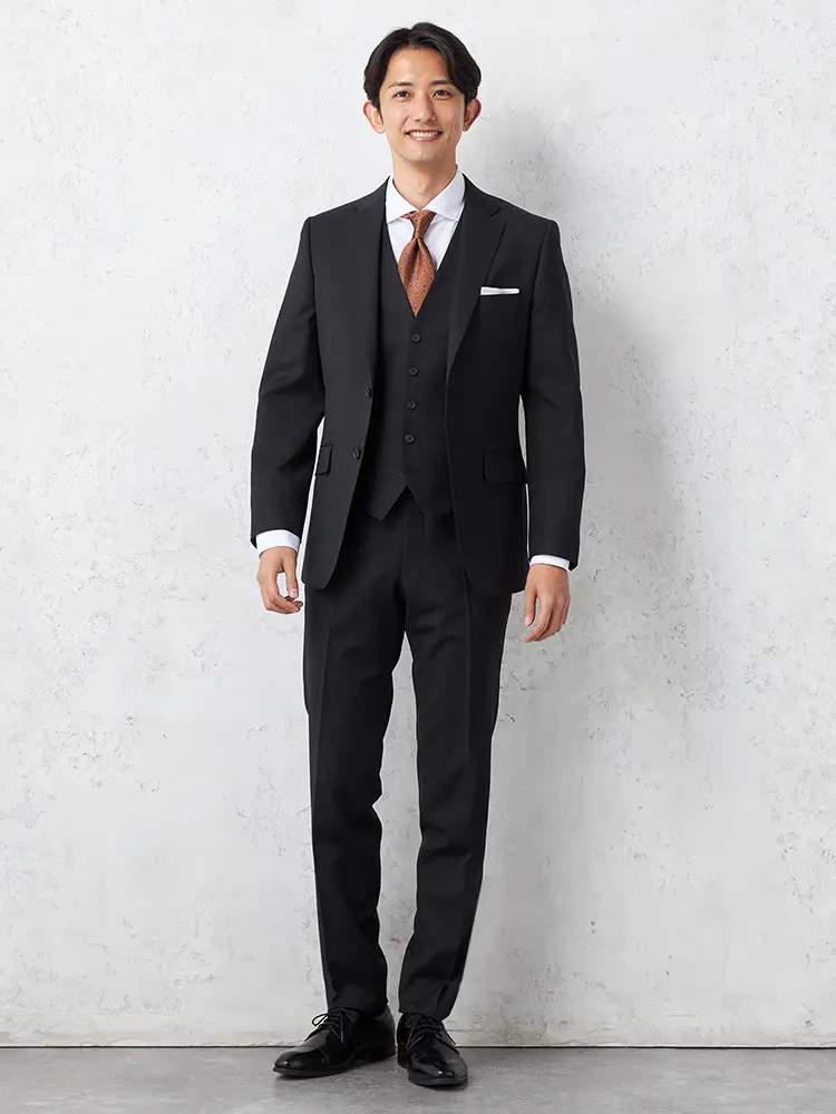 背抜き仕立てとサイドベンツで動きやすく、パンツは美脚に見えるノータック仕様。