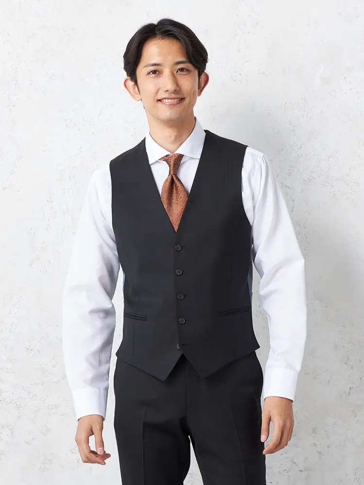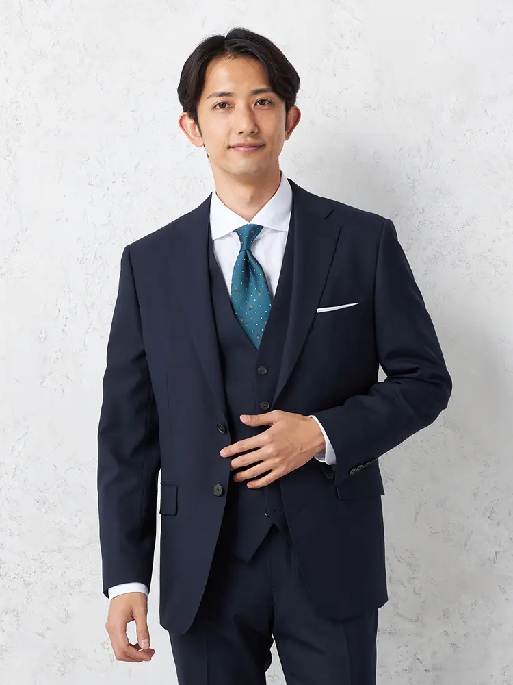 ジャケット、パンツ、ベストの3点セットで、スーツ全体を簡単にコーディネートできます。ビジネスやフォーマルな場面に最適です。