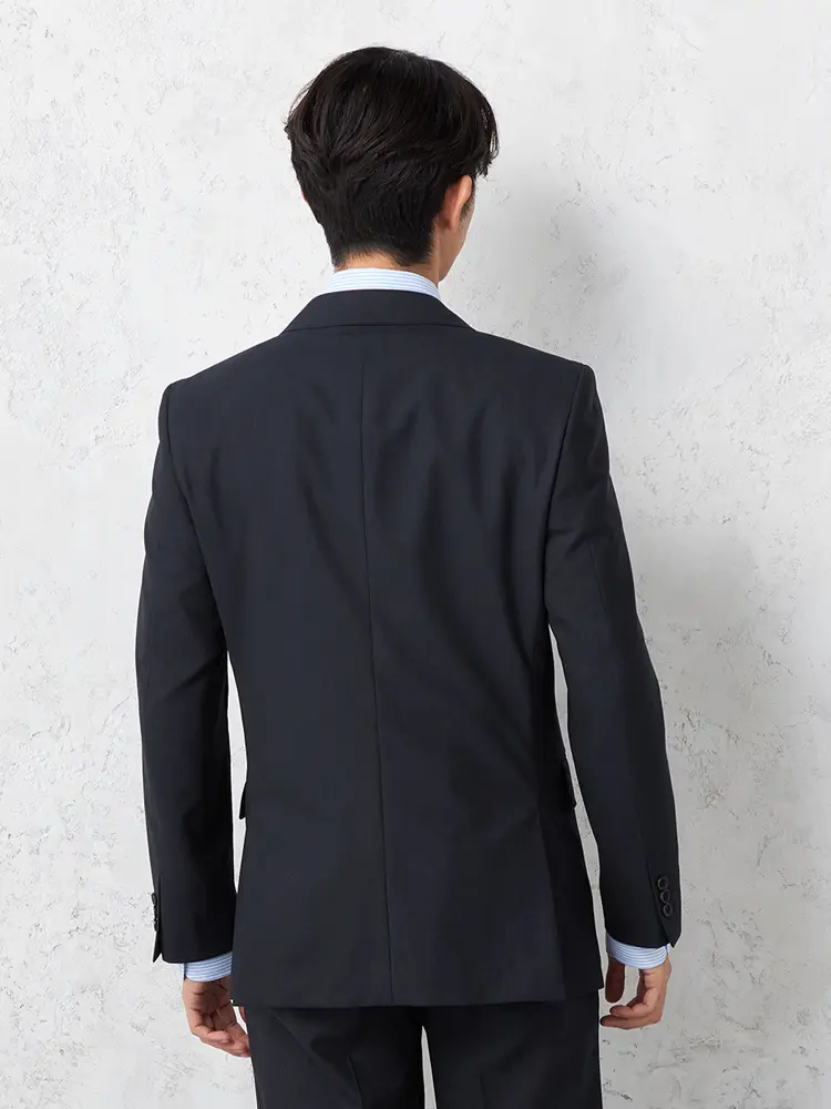 ビジネスやセレモニーに重宝するブラック無地スーツ。