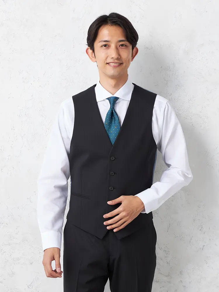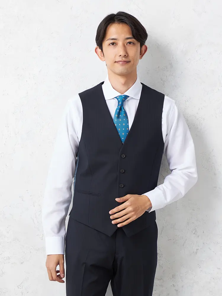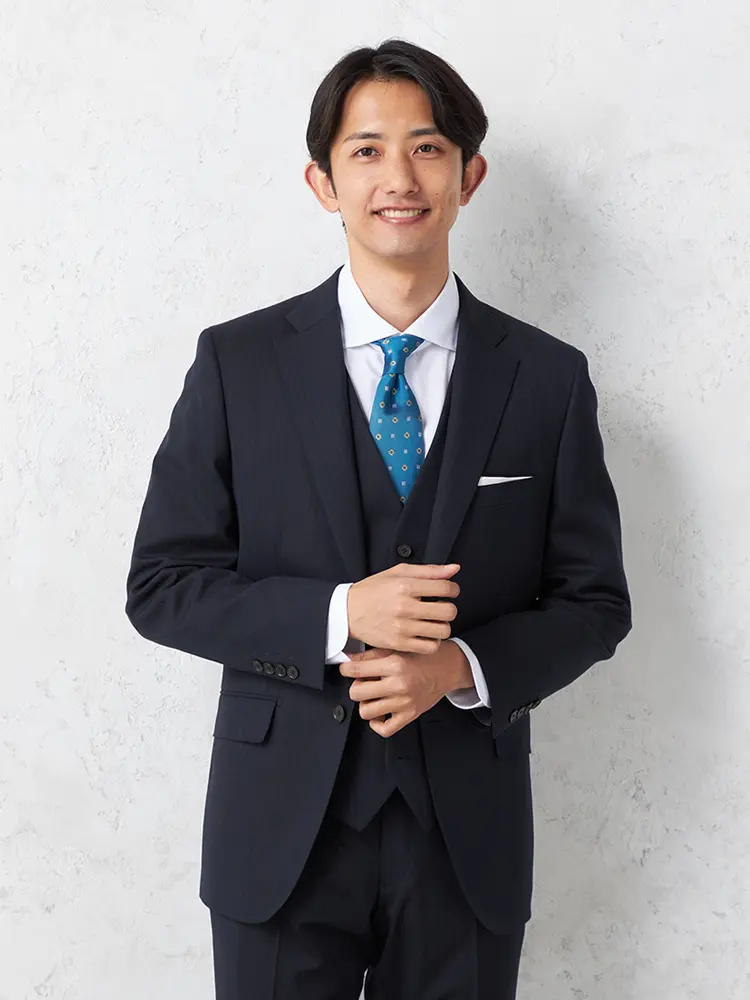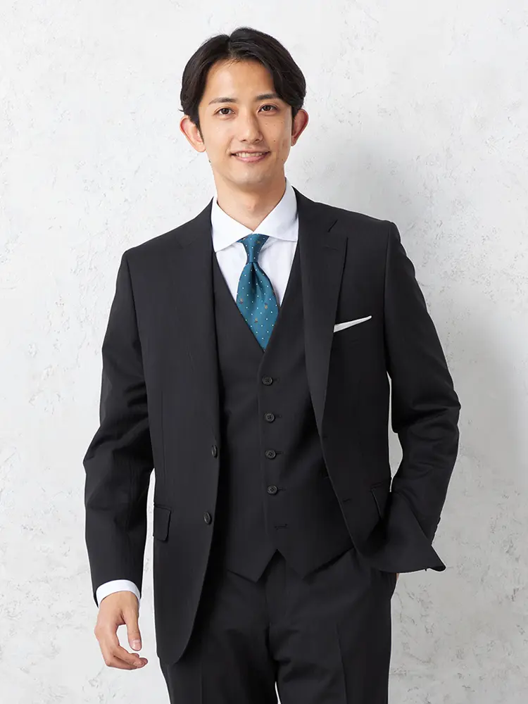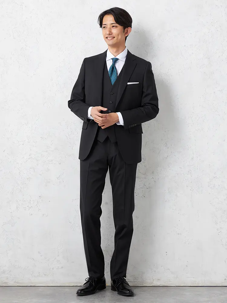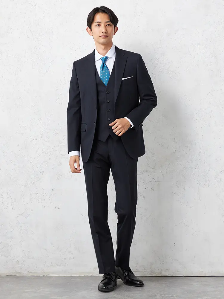 軽やかなポリエステル×ウールの3ピーススーツ。