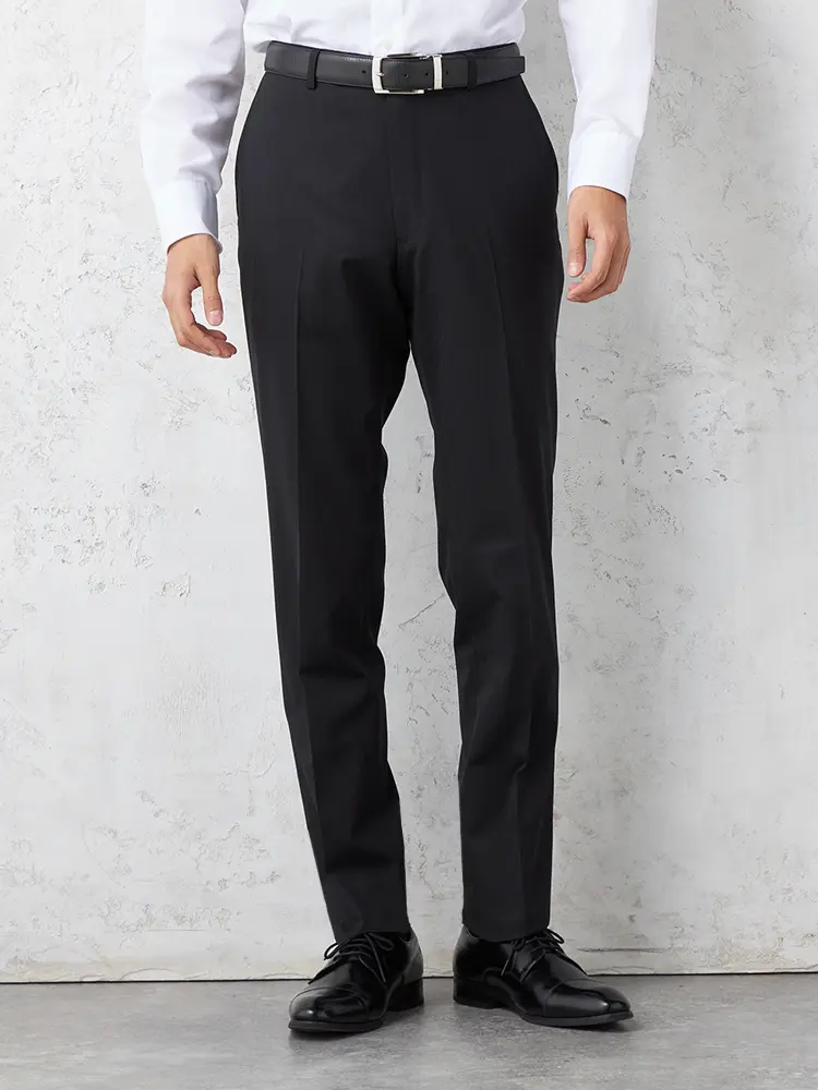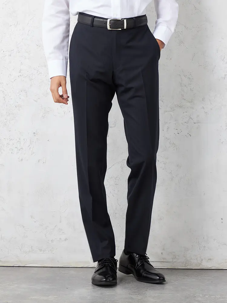 パンツの腰回りに生地の折り込みがなく、スッキリとしたシルエットを実現します。シンプルで洗練された印象を与え、すっきりとした着こなしが可能です。