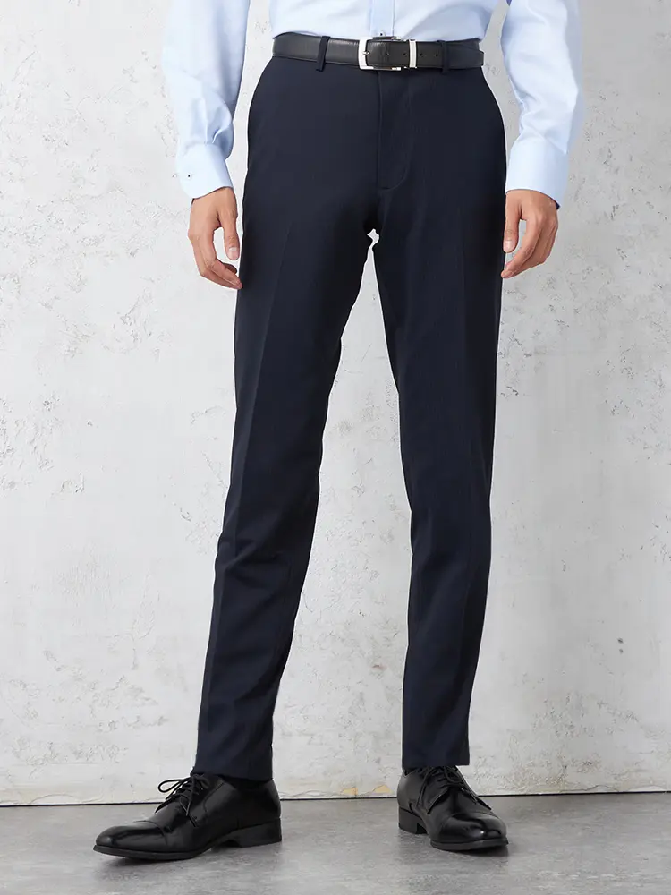 パンツの腰回りに生地の折り込みがなく、スッキリとしたシルエットを実現します。シンプルで洗練された印象を与え、すっきりとした着こなしが可能です。