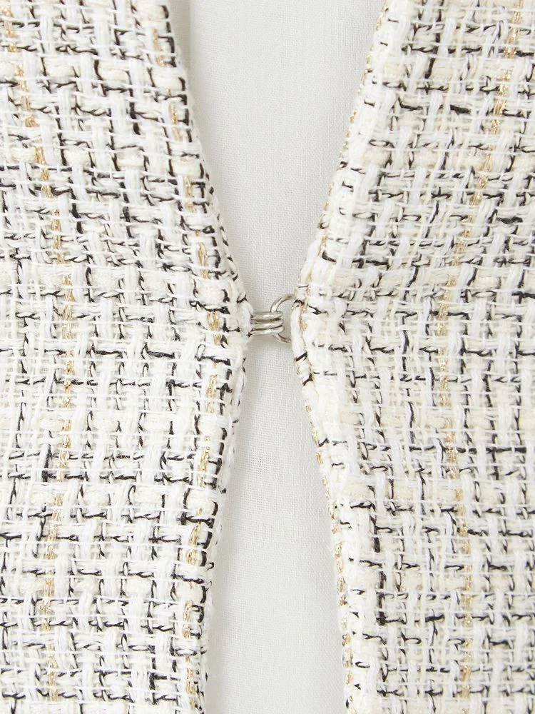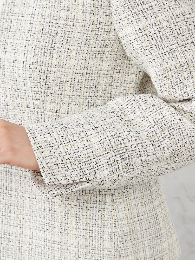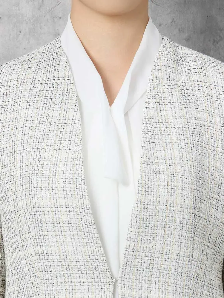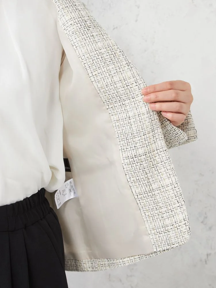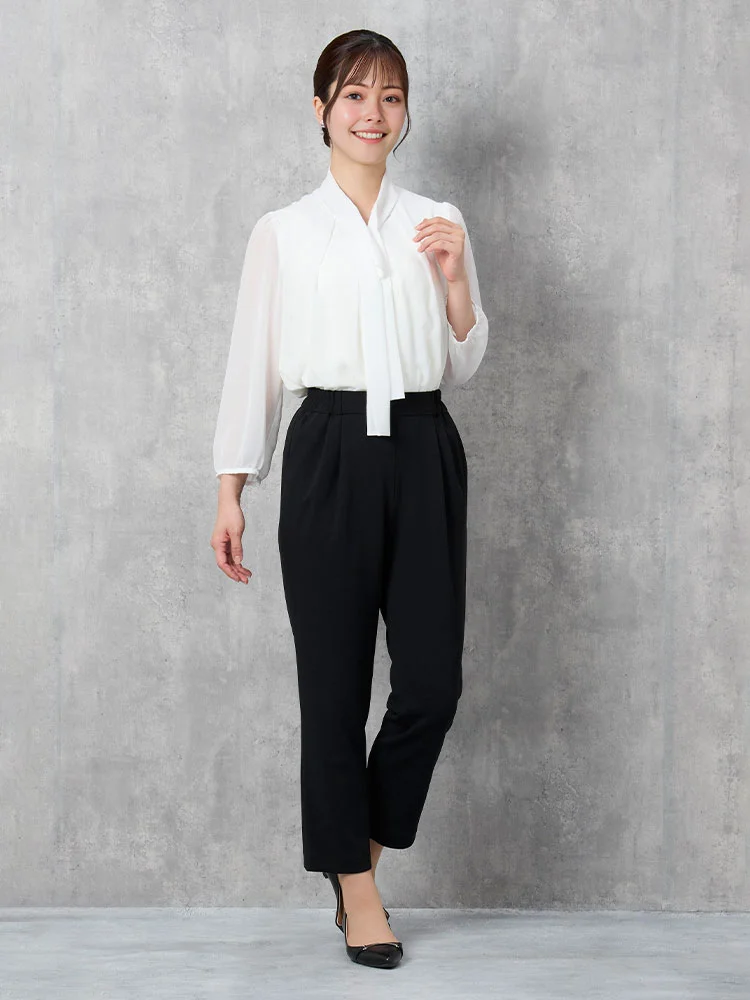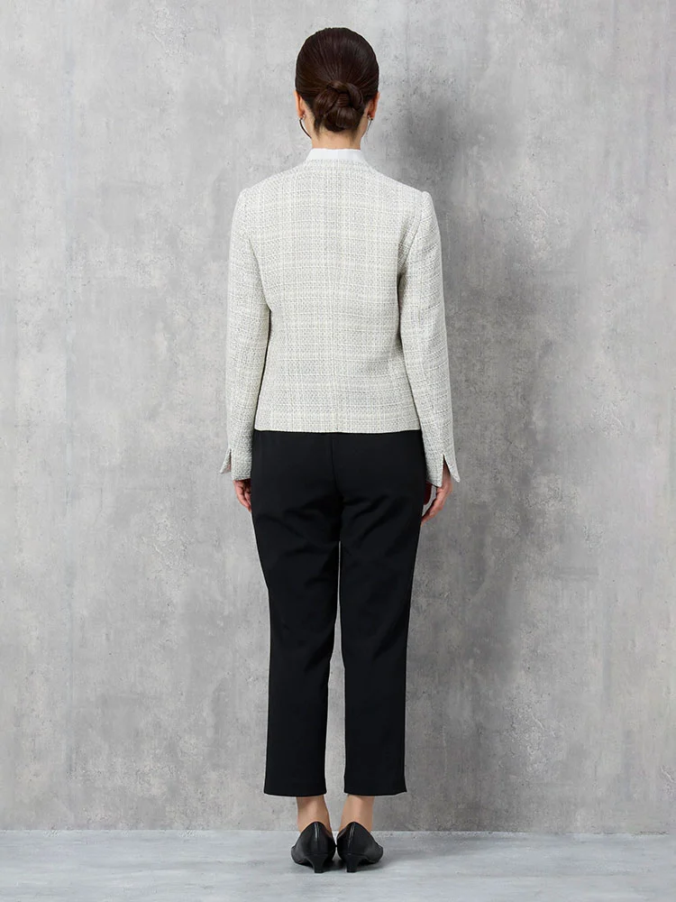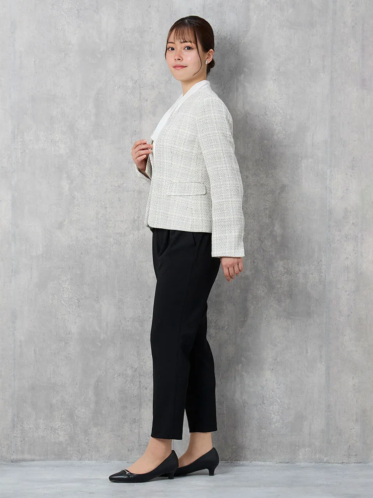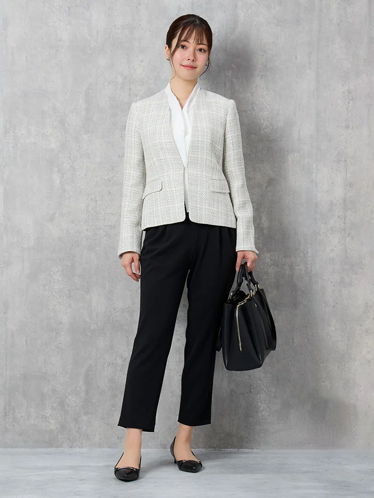 ツイードジャケットとボウタイブラウス、無地のテーパードパンツをセットにしました。