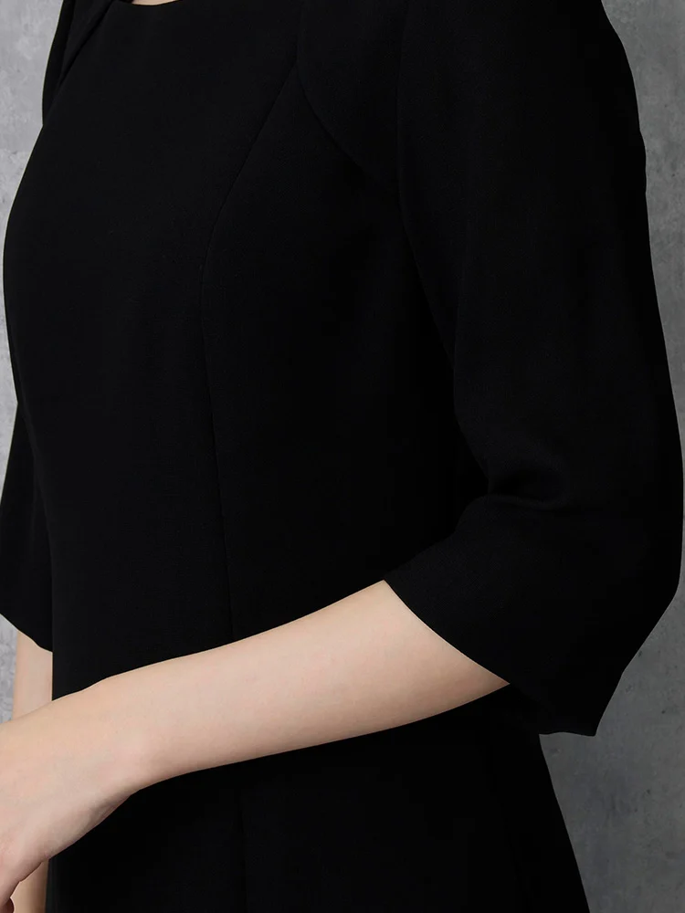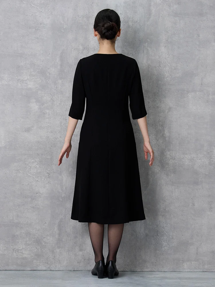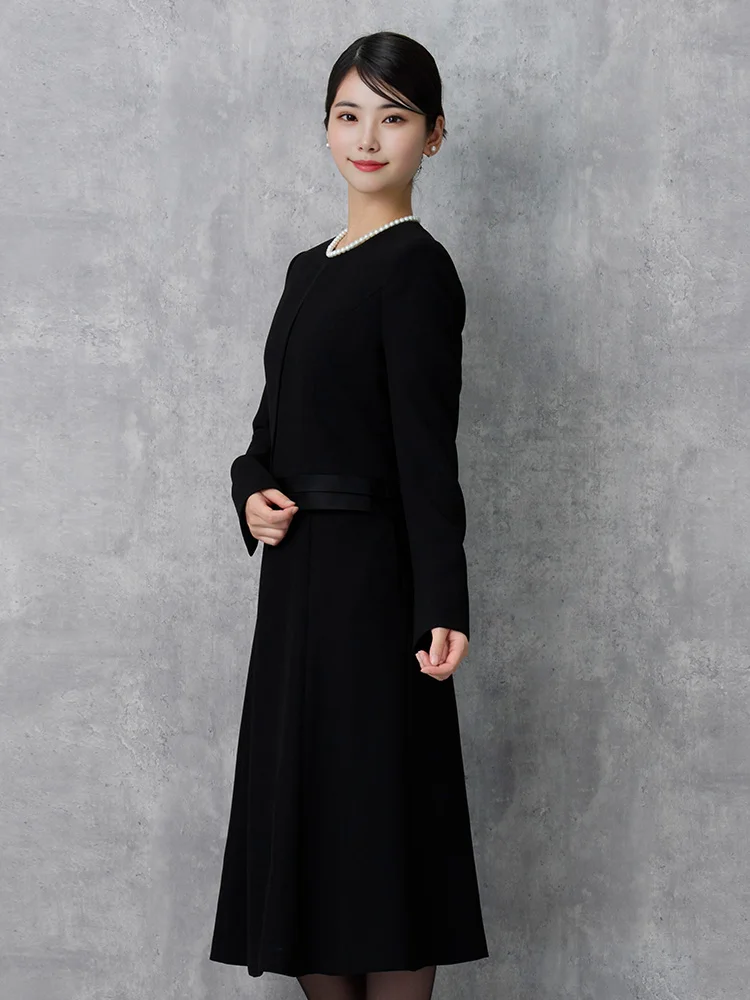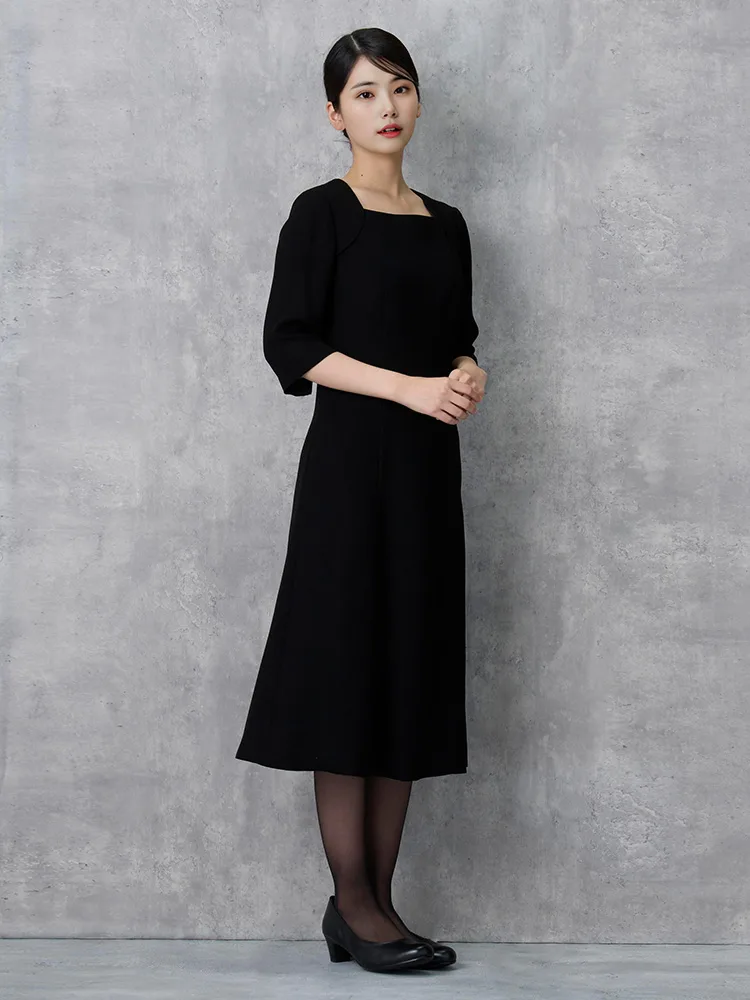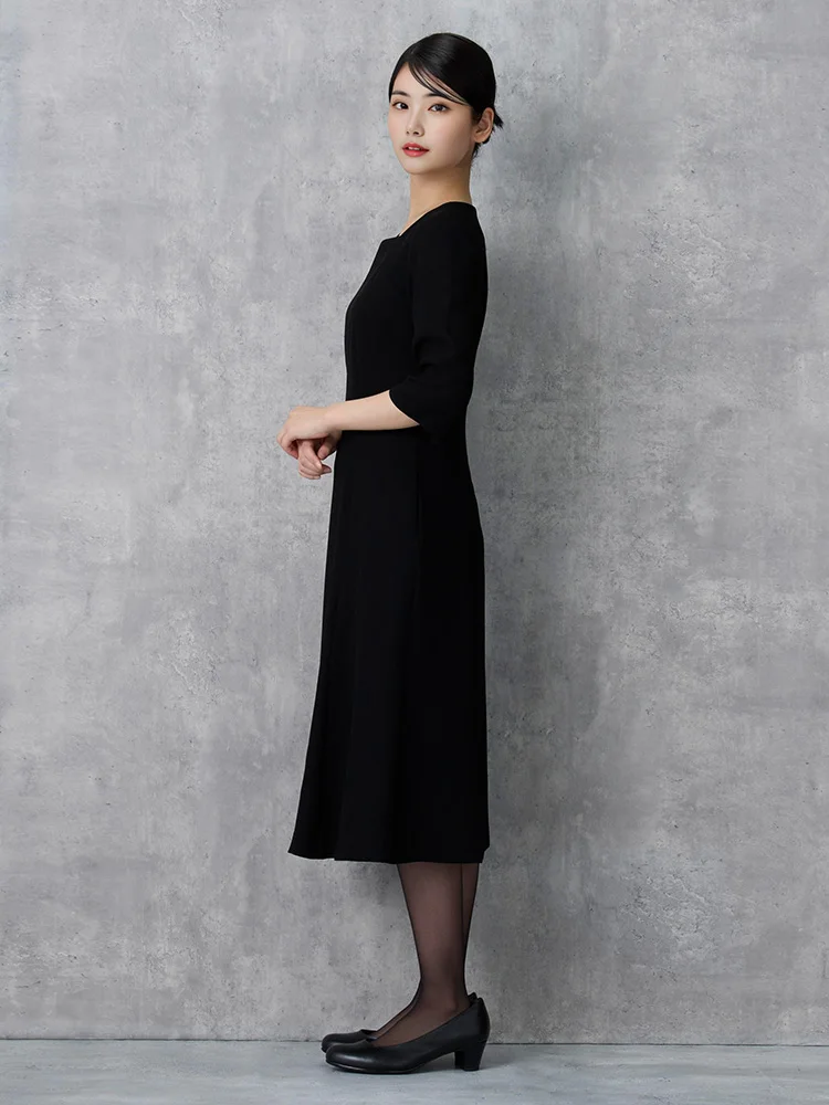 7分袖ワンピースとノーカラージャケットを組み合わせた、フォーマル対応のセットアップです。