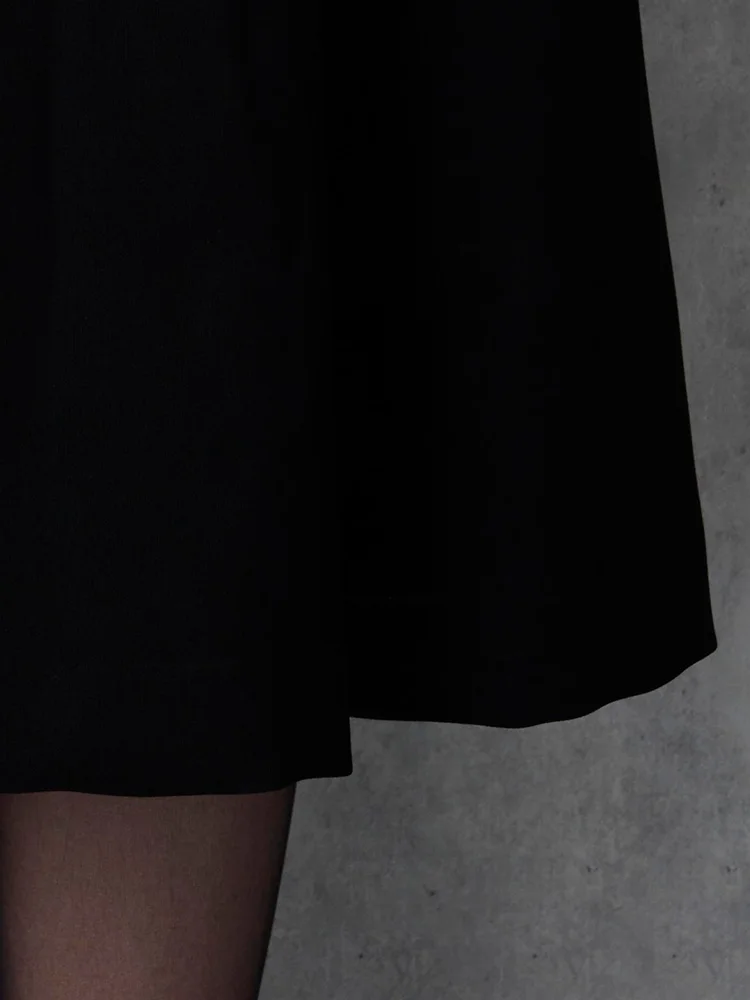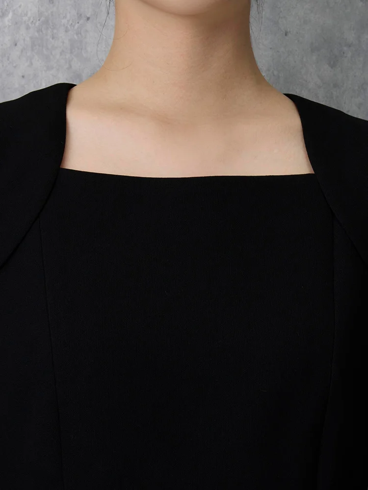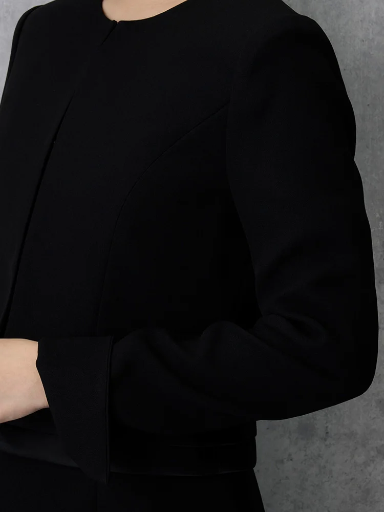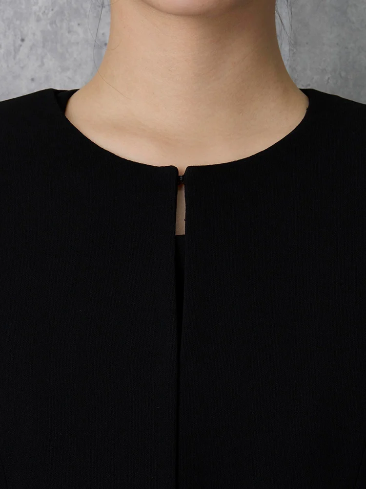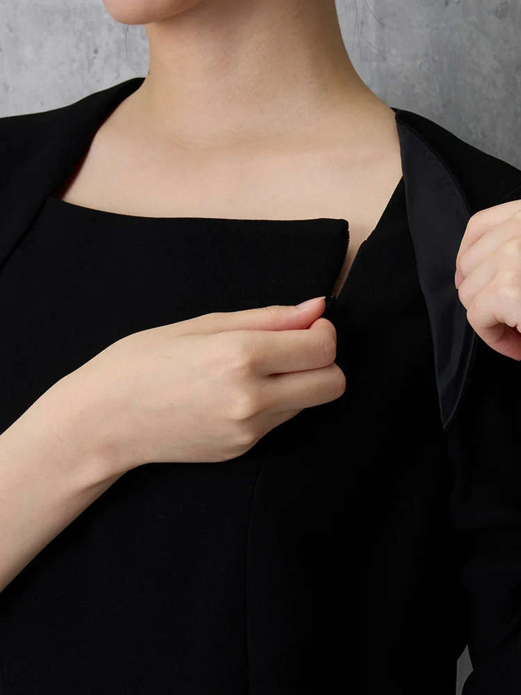 7分袖ワンピースとノーカラージャケットを組み合わせた、フォーマル対応のセットアップです。