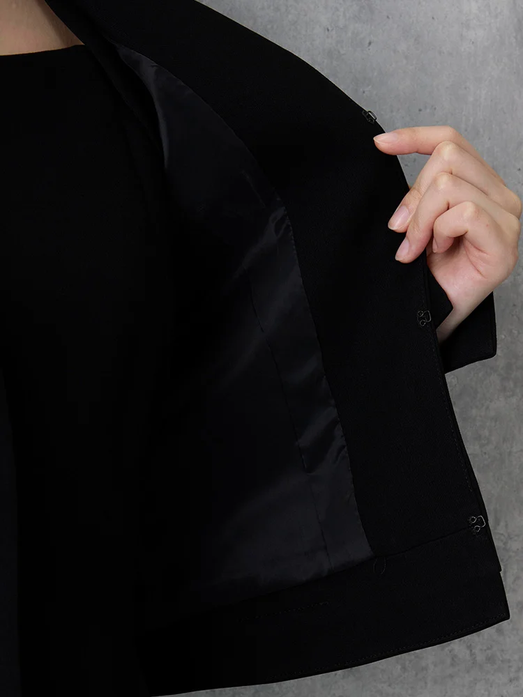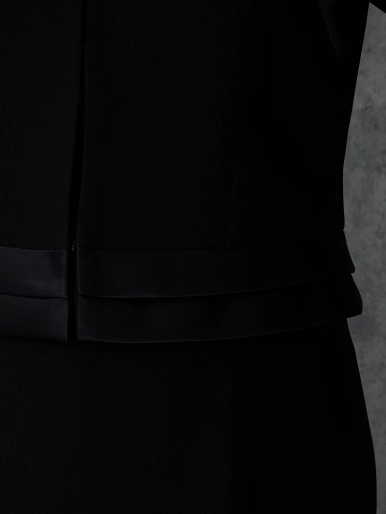ジャケットは裾を艶めくサテンで切り替えて、エレガントさをプラス。