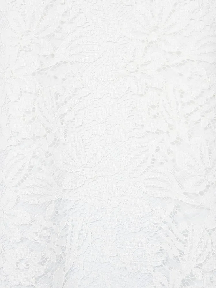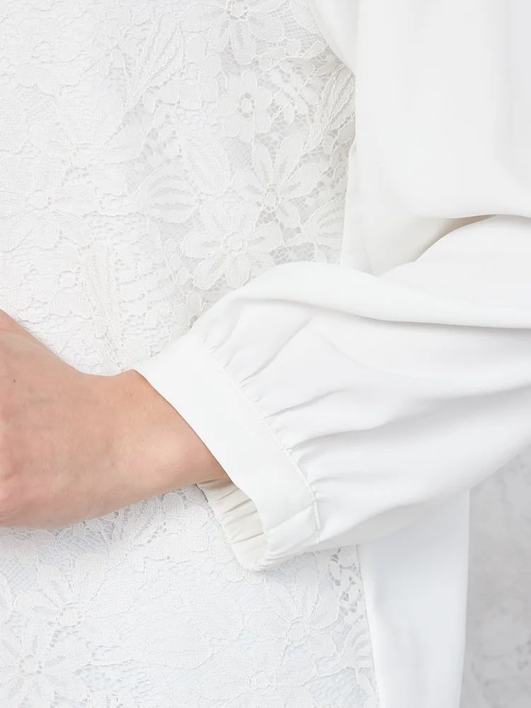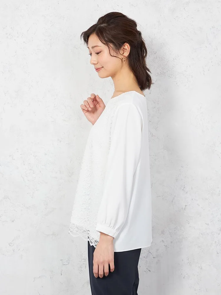 前身頃には繊細なレースを重ねていて、袖口のギャザーとも相まってエレガントさをアピールします。