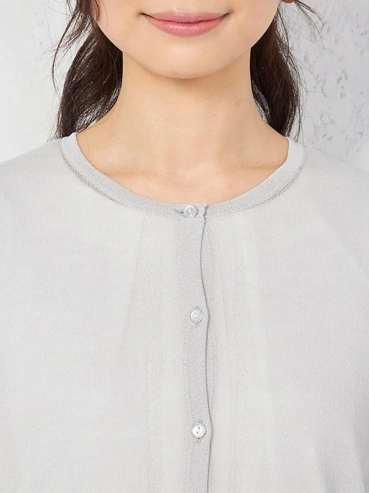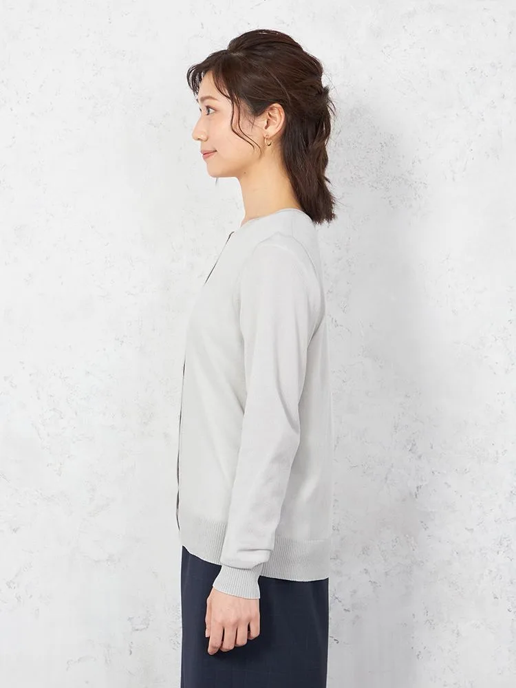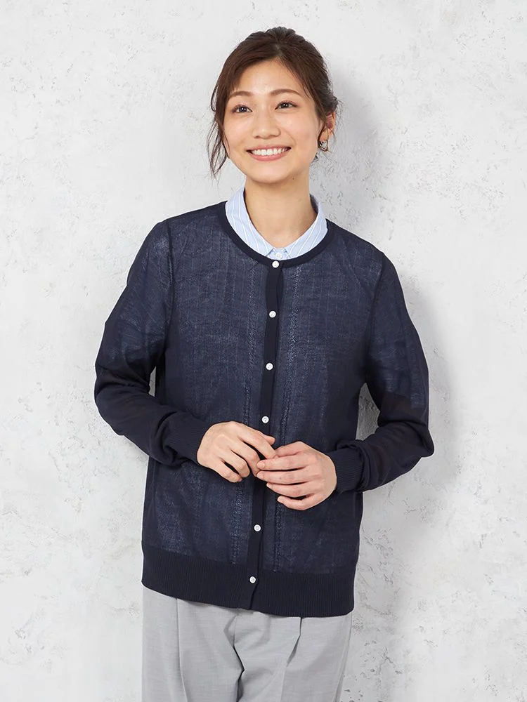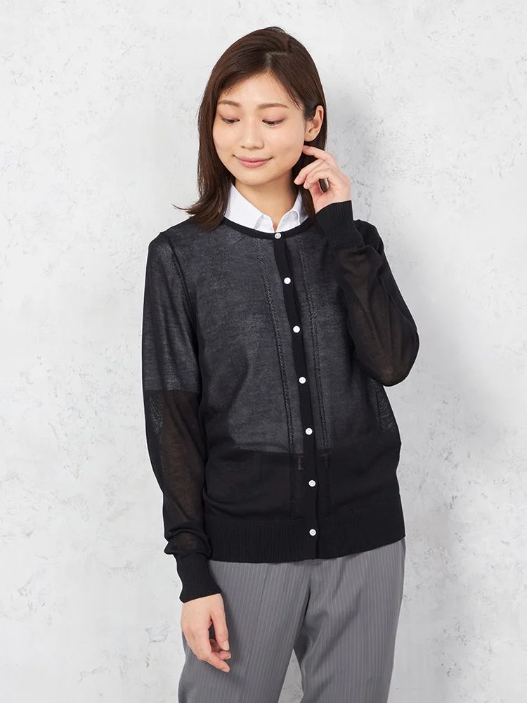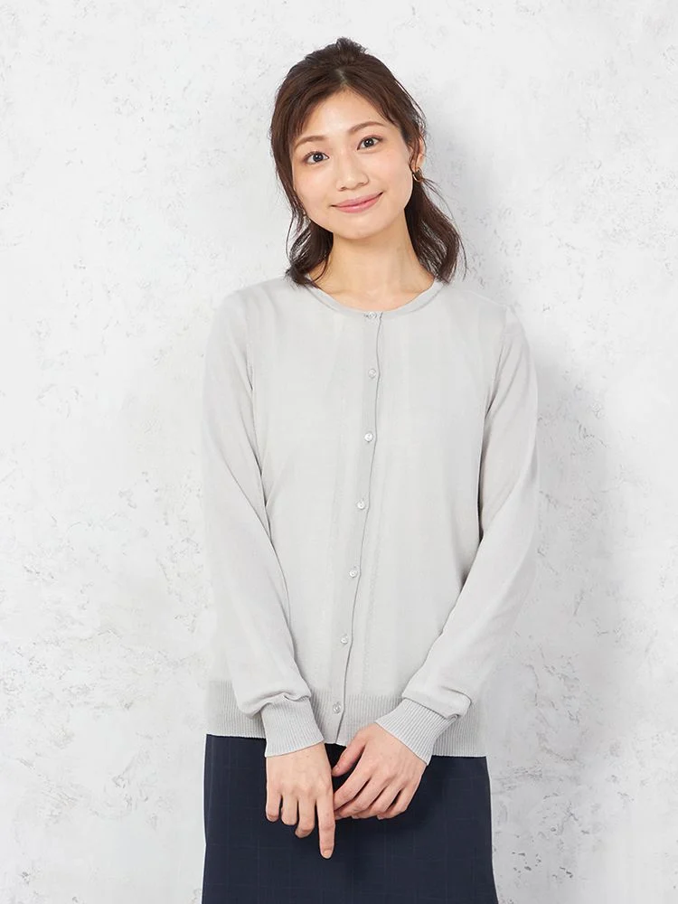 シアーな質感で女性らしく着こなせる、長袖のクルーネックカーディガン。