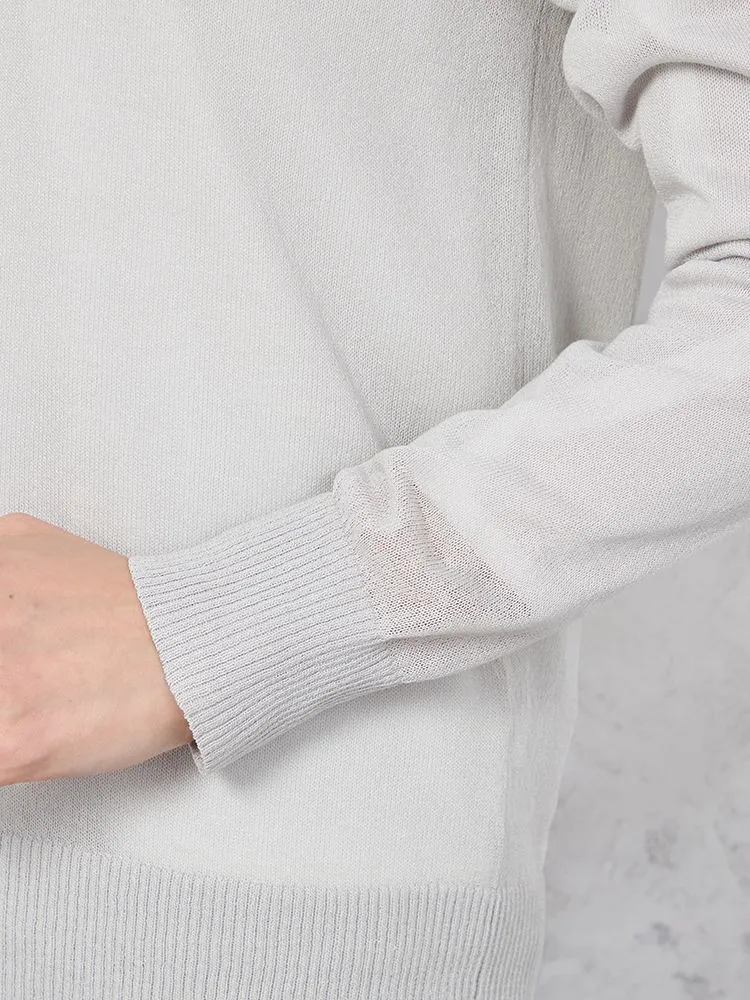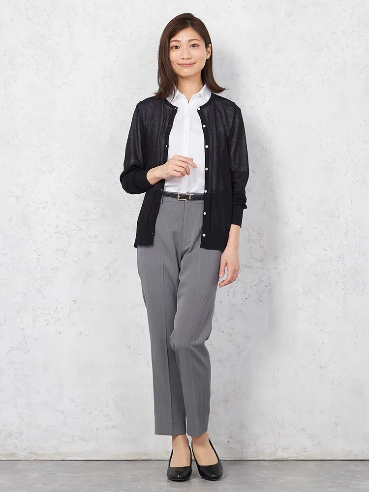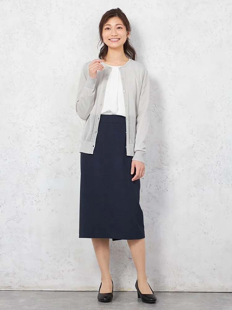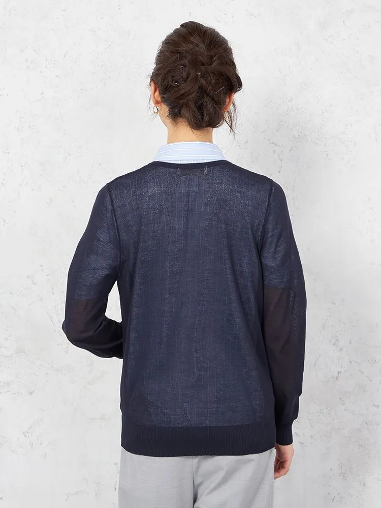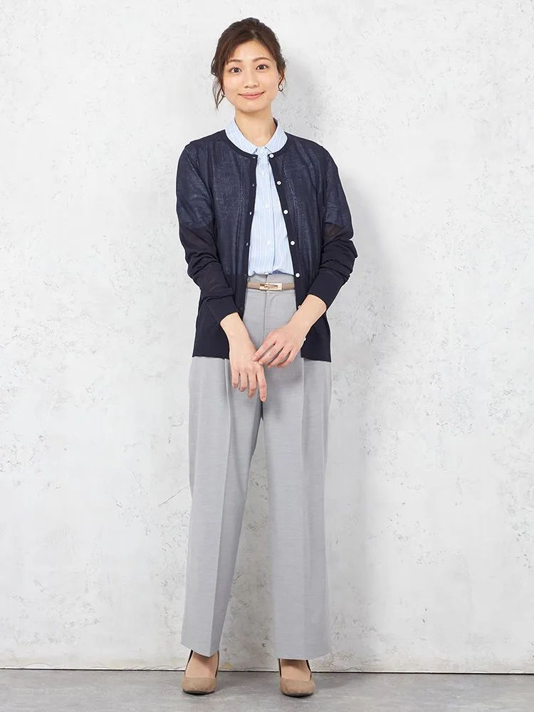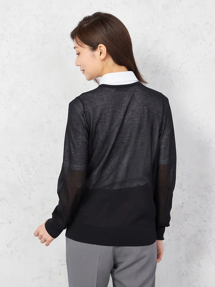 シアーな質感で女性らしく着こなせる、長袖のクルーネックカーディガン。
