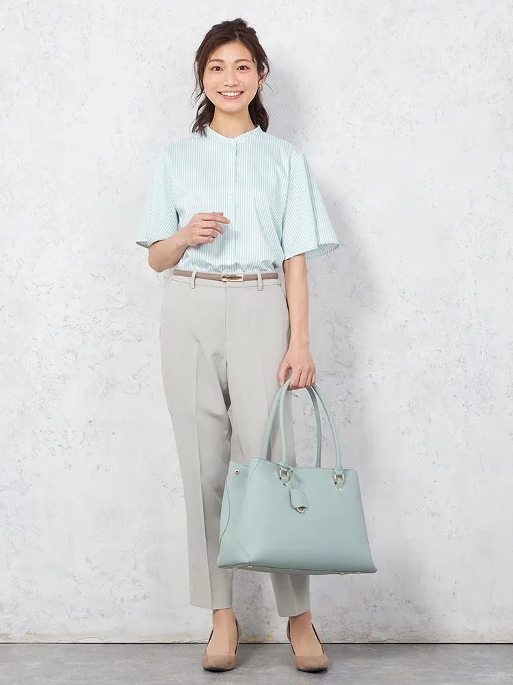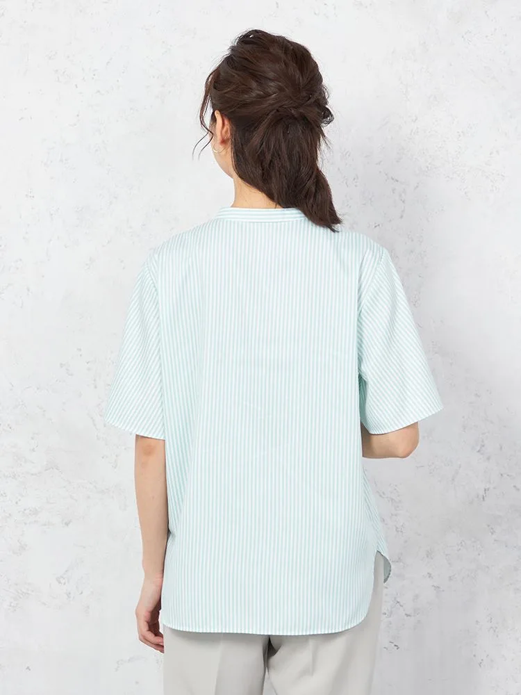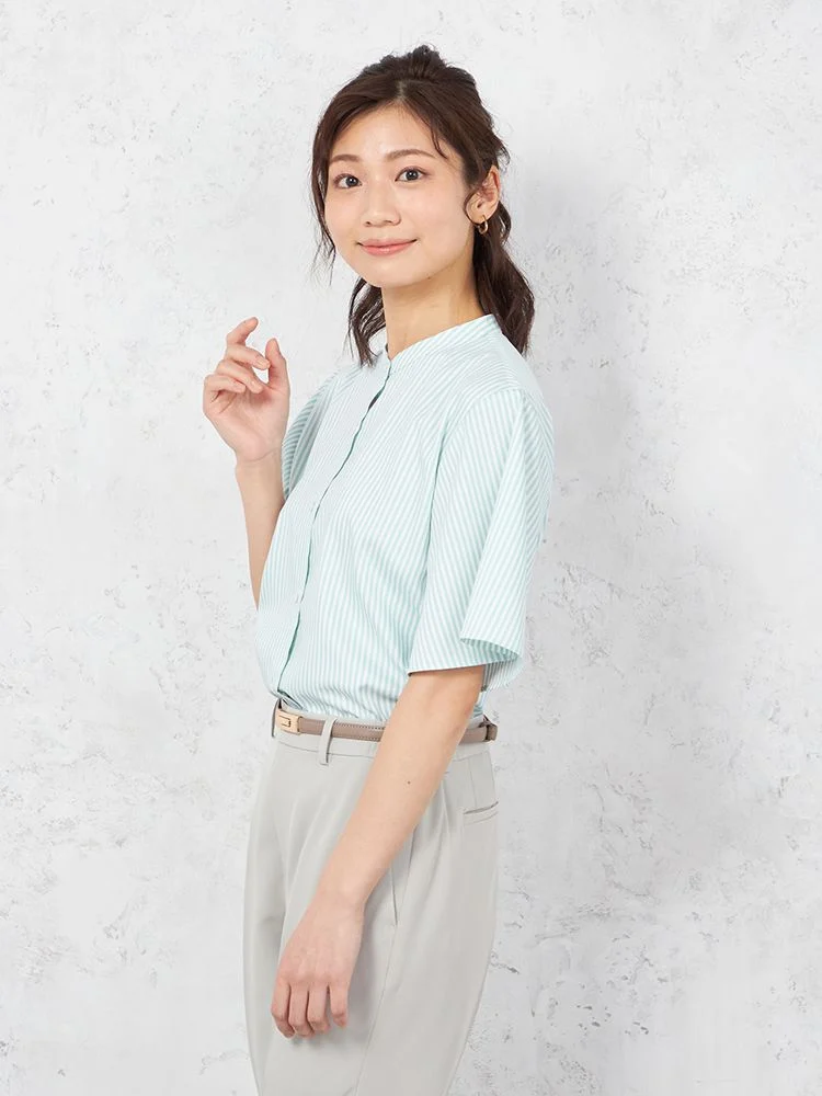 【涼感】ブラウス 半袖 バンドカラー ストライプ【形態安定/遮熱/UVカット/透け防止/接触冷感】 SOFFICE 春夏【レディース】