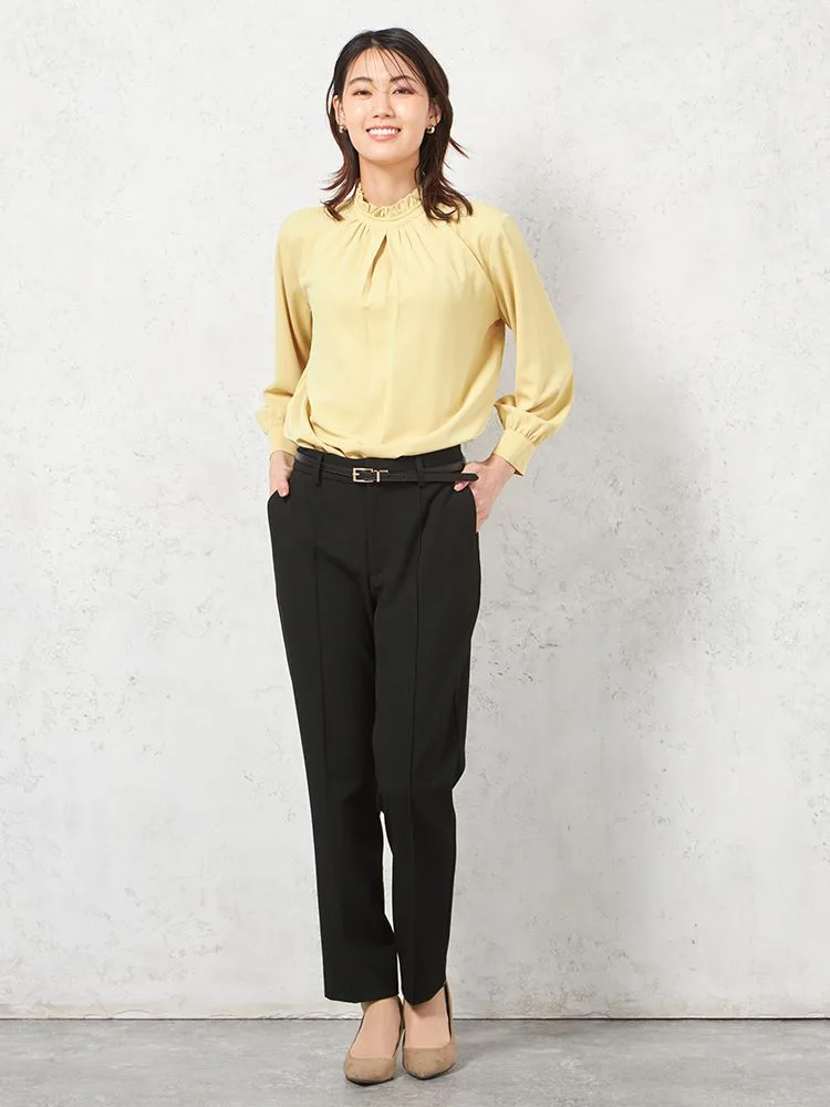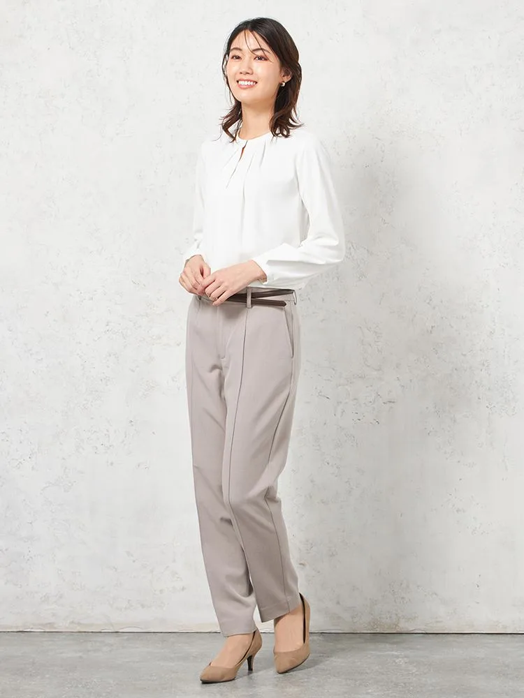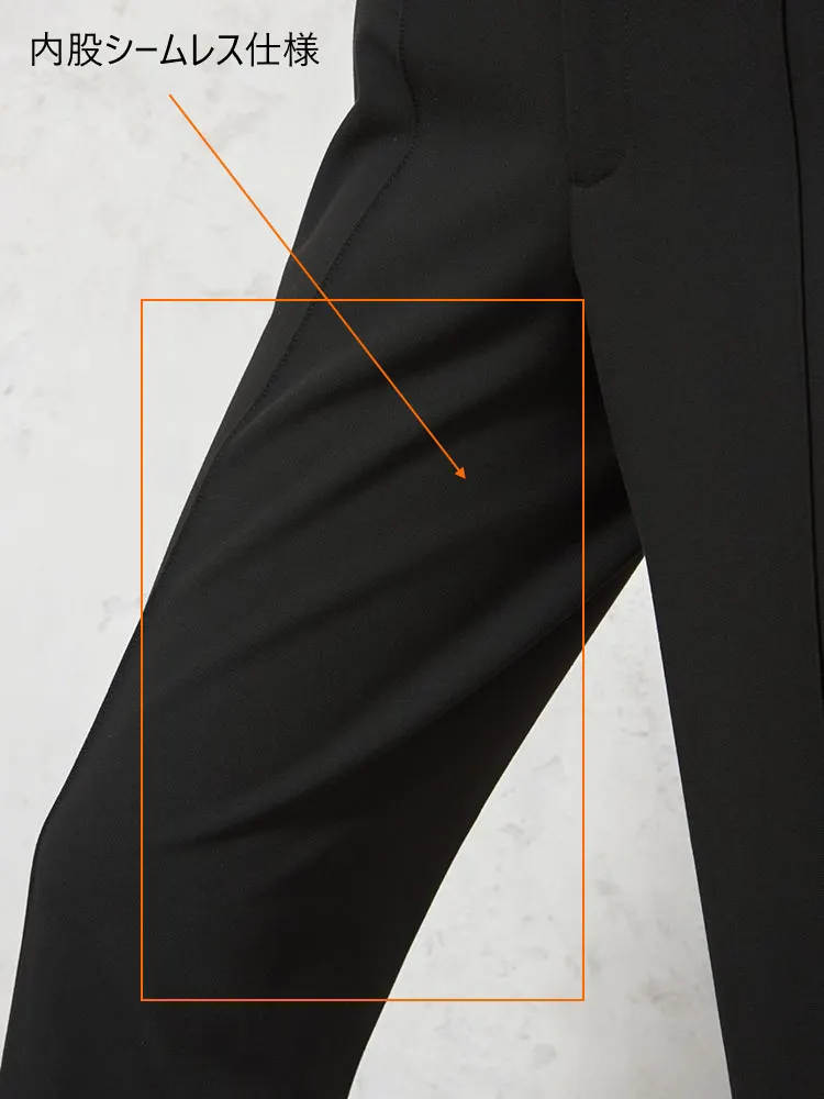 パンツの腰回りに生地の折り込みがなく、スッキリとしたシルエットを実現します。シンプルで洗練された印象を与え、すっきりとした着こなしが可能です。