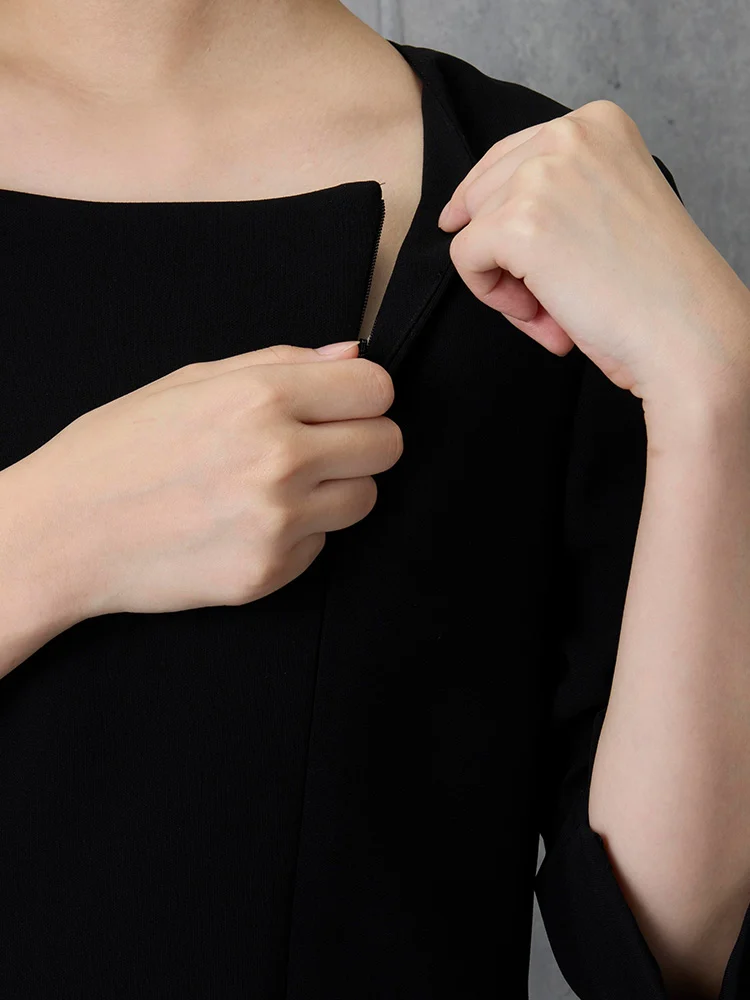 ボディラインにきれいに沿うフレアシルエットのワンピースは、前開きファスナーで着脱も簡単。