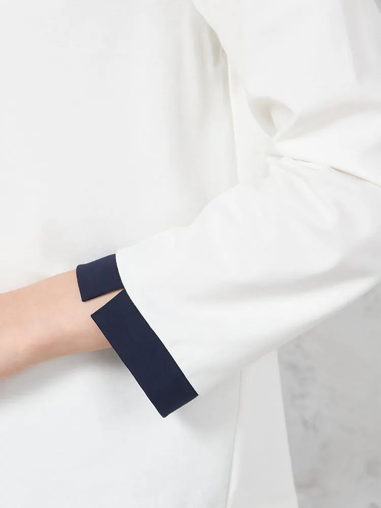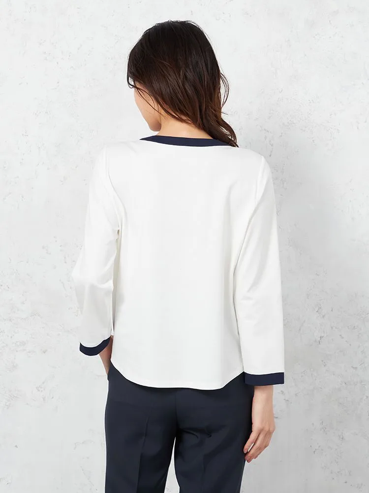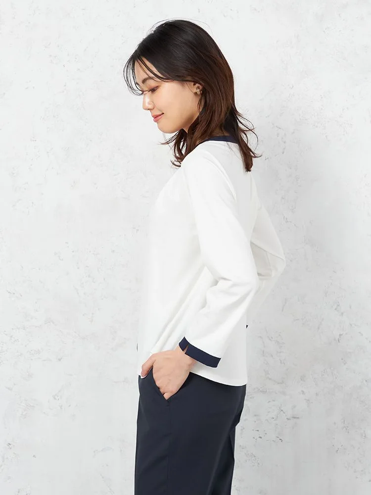 メリハリのあるバイカラーデザインで仕上げ、スキッパーネックには控えめなメタルボタンをアクセントであしらいました。